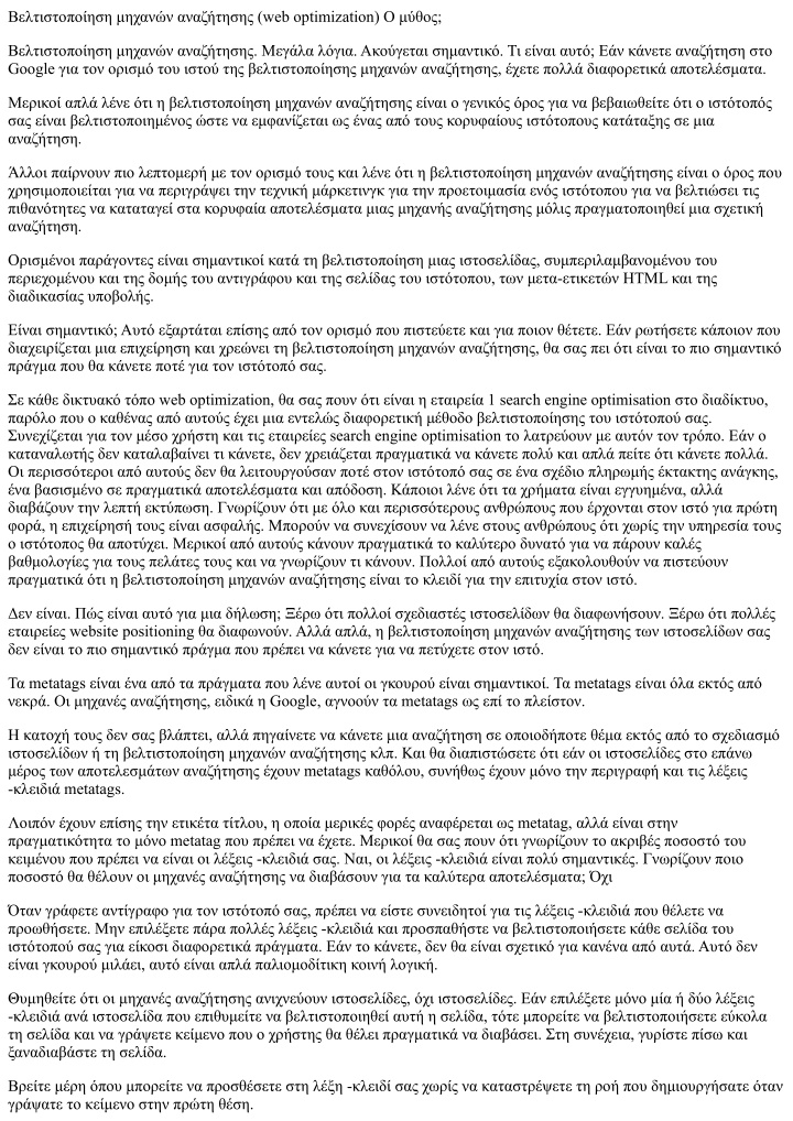 Βελτιστοποίηση μηχανών αναζήτησης (web optimization) Ο μύθος; Βελτιστοποίηση μηχανών αναζήτησης. Μεγάλα λόγια. Ακούγεται σημαντικό. Τι είναι αυτό; Εάν κάνετε αναζήτηση στο Google για τον ορισμό του ιστού της βελτιστοποίησης μηχανών αναζήτησης, έχετε πολλά διαφορετικά αποτελέσματα. Μερικοί απλά λένε ότι η βελτιστοποίηση μηχανών αναζήτησης είναι ο γενικός όρος για να βεβαιωθείτε ότι ο ιστότοπός σας είναι βελτιστοποιημένος ώστε να εμφανίζεται ως ένας από τους κορυφαίους ιστότοπους κατάταξης σε μια αναζήτηση. Άλλοι παίρνουν πιο λεπτομερή με τον ορισμό τους και λένε ότι η βελτιστοποίηση μηχανών αναζήτησης είναι ο όρος που χρησιμοποιείται για να περιγράψει την τεχνική μάρκετινγκ για την προετοιμασία ενός ιστότοπου για να βελτιώσει τις πιθανότητες να καταταγεί στα κορυφαία αποτελέσματα μιας μηχανής αναζήτησης μόλις πραγματοποιηθεί μια σχετική αναζήτηση. Ορισμένοι παράγοντες είναι σημαντικοί κατά τη βελτιστοποίηση μιας ιστοσελίδας, συμπεριλαμβανομένου του περιεχομένου και της δομής του αντιγράφου και της σελίδας του ιστότοπου, των μετα-ετικετών HTML και της διαδικασίας υποβολής. Είναι σημαντικό; Αυτό εξαρτάται επίσης από τον ορισμό που πιστεύετε και για ποιον θέτετε. Εάν ρωτήσετε κάποιον που διαχειρίζεται μια επιχείρηση και χρεώνει τη βελτιστοποίηση μηχανών αναζήτησης, θα σας πει ότι είναι το πιο σημαντικό πράγμα που θα κάνετε ποτέ για τον ιστότοπό σας. Σε κάθε δικτυακό τόπο web optimization, θα σας πουν ότι είναι η εταιρεία 1 search engine optimisation στο διαδίκτυο, παρόλο που ο καθένας από αυτούς έχει μια εντελώς διαφορετική μέθοδο βελτιστοποίησης του ιστότοπού σας. Συνεχίζεται για τον μέσο χρήστη και τις εταιρείες search engine optimisation το λατρεύουν με αυτόν τον τρόπο. Εάν ο καταναλωτής δεν καταλαβαίνει τι κάνετε, δεν χρειάζεται πραγματικά να κάνετε πολύ και απλά πείτε ότι κάνετε πολλά. Οι περισσότεροι από αυτούς δεν θα λειτουργούσαν ποτέ στον ιστότοπό σας σε ένα σχέδιο πληρωμής έκτακτης ανάγκης, ένα βασισμένο σε πραγματικά αποτελέσματα και απόδοση. Κάποιοι λένε ότι τα χρήματα είναι εγγυημένα, αλλά διαβάζουν την λεπτή εκτύπωση. Γνωρίζουν ότι με όλο και περισσότερους ανθρώπους που έρχονται στον ιστό για πρώτη φορά, η επιχείρησή τους είναι ασφαλής. Μπορούν να συνεχίσουν να λένε στους ανθρώπους ότι χωρίς την υπηρεσία τους ο ιστότοπος θα αποτύχει. Μερικοί από αυτούς κάνουν πραγματικά το καλύτερο δυνατό για να πάρουν καλές βαθμολογίες για τους πελάτες τους και να γνωρίζουν τι κάνουν. Πολλοί από αυτούς εξακολουθούν να πιστεύουν πραγματικά ότι η βελτιστοποίηση μηχανών αναζήτησης είναι το κλειδί για την επιτυχία στον ιστό. Δεν είναι. Πώς είναι αυτό για μια δήλωση; Ξέρω ότι πολλοί σχεδιαστές ιστοσελίδων θα διαφωνήσουν. Ξέρω ότι πολλές εταιρείες website positioning θα διαφωνούν. Αλλά απλά, η βελτιστοποίηση μηχανών αναζήτησης των ιστοσελίδων σας δεν είναι το πιο σημαντικό πράγμα που πρέπει να κάνετε για να πετύχετε στον ιστό. Τα metatags είναι ένα από τα πράγματα που λένε αυτοί οι γκουρού είναι σημαντικοί. Τα metatags είναι όλα εκτός από νεκρά. Οι μηχανές αναζήτησης, ειδικά η Google, αγνοούν τα metatags ως επί το πλείστον. Η κατοχή τους δεν σας βλάπτει, αλλά πηγαίνετε να κάνετε μια αναζήτηση σε οποιοδήποτε θέμα εκτός από το σχεδιασμό ιστοσελίδων ή τη βελτιστοποίηση μηχανών αναζήτησης κλπ. Και θα διαπιστώσετε ότι εάν οι ιστοσελίδες στο επάνω μέρος των αποτελεσμάτων αναζήτησης έχουν metatags καθό