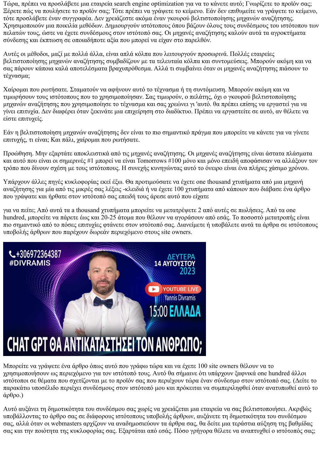 Πόσο χρόνο πρέπει να επενδύσετε; Εάν δεν είστε καλοί στο να γράφετε άρθρα ή να μην έχετε το χρόνο, προσλάβετε έναν συγγραφέα για να τα γράψετε για εσάς με το byline σας και τους συνδέσμους σας στο το υποσέλιδο. έτσι ώστε να είμαστε σαφείς. Η βελτιστοποίηση μηχανών αναζήτησης είναι απαραίτητη, αλλά σε καμία περίπτωση το πιο σημαντικό πράγμα που μπορείτε να κάνετε για τον ιστότοπό σας για να το κάνετε επιτυχές. Δεν θα πληρώσω πολλά χρήματα για αυτήν την υπηρεσία. Η προώθηση του ιστότοπού σας είναι το πιο σημαντικό πράγμα που μπορείτε να κάνετε. Τα άρθρα είναι μόνο μία από τις μεθόδους που μπορείτε να χρησιμοποιήσετε για να προωθήσετε τον ιστότοπό σας. Η λίστα ελέγχου μου: 1. Να είστε ενήμεροι για τις λέξεις -κλειδιά που θέλετε να στοχεύσετε με κάθε ιστοσελίδα που δημιουργείτε. Γράψτε το κείμενό σας για τον αναγνώστη και, στη συνέχεια, επιστρέψτε και προσθέστε τις λέξεις -κλειδιά σας χωρίς να καταστρέψετε τη ροή του κειμένου σας. 2. Βεβαιωθείτε ότι ο ιστότοπος είναι εύκολος στην πλοήγηση και φιλική προς το χρήστη. Μην υποθέσετε ότι ο πελάτης γνωρίζει τον ιστότοπο καθώς και εσείς. Κάντε το απλό. Κάντε εύκολο να βρείτε το κουμπί αγοράς! 3. Μόλις ο ιστότοπος είναι κατασκευασμένος, σταματήστε να ανησυχείτε για το νεότερο τεχνικό μηχανής αναζήτησης ή τεχνική βελτιστοποίησης, όπως μερικοί επιθυμούν να το ονομάσουν. four. Αναζητήστε ιστολόγια και φόρουμ με συναφή θέματα και εγγραφείτε για αυτά και συμμετέχετε σε συζητήσεις με τον σύνδεσμό σας στη γραμμή υπογραφής σας.