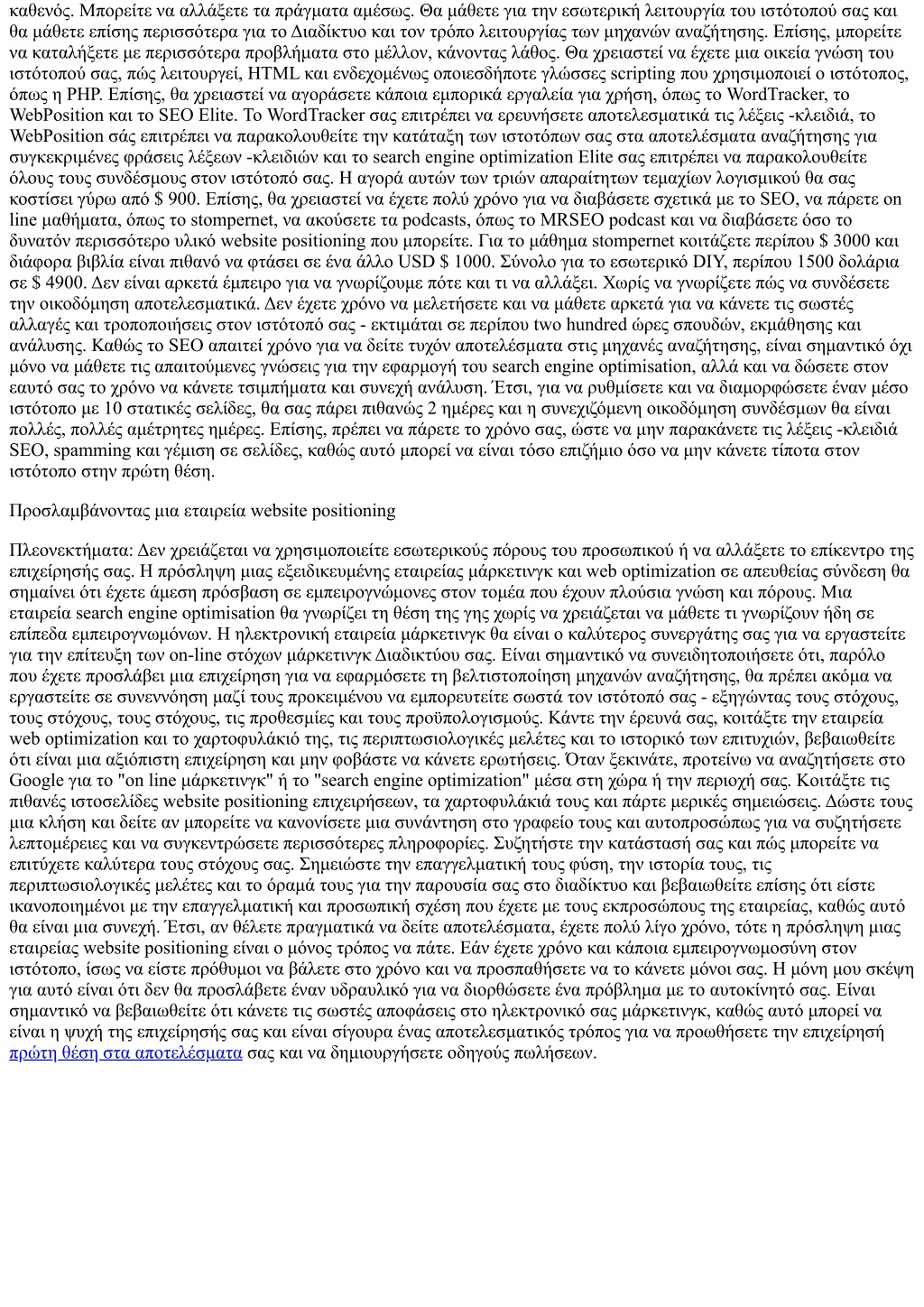 καθενός. Μπορείτε να αλλάξετε τα πράγματα αμέσως. Θα μάθετε για την εσωτερική λειτουργία του ιστότοπού σας και θα μάθετε επίσης περισσότερα για το Διαδίκτυο και τον τρόπο λειτουργίας των μηχανών αναζήτησης. Επίσης, μπορείτε να καταλήξετε με περισσότερα προβλήματα στο μέλλον, κάνοντας λάθος. Θα χρειαστεί να έχετε μια οικεία γνώση του ιστότοπού σας, πώς λειτουργεί, HTML και ενδεχομένως οποιεσδήποτε γλώσσες scripting που χρησιμοποιεί ο ιστότοπος, όπως η PHP. Επίσης, θα χρειαστεί να αγοράσετε κάποια εμπορικά εργαλεία για χρήση, όπως το WordTracker, το WebPosition και το SEO Elite. Το WordTracker σας επιτρέπει να ερευνήσετε αποτελεσματικά τις λέξεις -κλειδιά, το WebPosition σάς επιτρέπει να παρακολουθείτε την κατάταξη των ιστοτόπων σας στα αποτελέσματα αναζήτησης για συγκεκριμένες φράσεις λέξεων -κλειδιών και το search engine optimization Elite σας επιτρέπει να παρακολουθείτε όλους τους συνδέσμους στον ιστότοπό σας. Η αγορά αυτών των τριών απαραίτητων τεμαχίων λογισμικού θα σας κοστίσει γύρω από $ 900. Επίσης, θα χρειαστεί να έχετε πολύ χρόνο για να διαβάσετε σχετικά με το SEO, να πάρετε on line μαθήματα, όπως το stompernet, να ακούσετε τα podcasts, όπως το MRSEO podcast και να διαβάσετε όσο το δυνατόν περισσότερο υλικό website positioning που μπορείτε. Για το μάθημα stompernet κοιτάζετε περίπου $ 3000 και διάφορα βιβλία είναι πιθανό να φτάσει σε ένα άλλο USD $ 1000. Σύνολο για το εσωτερικό DIY, περίπου 1500 δολάρια σε $ 4900. Δεν είναι αρκετά έμπειρο για να γνωρίζουμε πότε και τι να αλλάξει. Χωρίς να γνωρίζετε πώς να συνδέσετε την οικοδόμηση αποτελεσματικά. Δεν έχετε χρόνο να μελετήσετε και να μάθετε αρκετά για να κάνετε τις σωστές αλλαγές και τροποποιήσεις στον ιστότοπό σας - εκτιμάται σε περίπου two hundred ώρες σπουδών, εκμάθησης και ανάλυσης. Καθώς το SEO απαιτεί χρόνο για να δείτε τυχόν αποτελέσματα στις μηχανές αναζήτησης, είναι σημαντικό όχι μόνο να μάθετε τις απαιτούμενες γνώσεις για την εφαρμογή του search engine optimisation, αλλά και να δώσετε στον εαυτό σας το χρόνο να κάνετε τσιμπήματα και συνεχή ανάλυση. Έτσι, για να ρυθμίσετε και να διαμορφώσετε έναν μέσο ιστότοπο με 10 στατικές σελίδες, θα σας πάρει πιθανώς 2 ημέρες και η συνεχιζόμενη οικοδόμηση συνδέσμων θα είναι πολλές, πολλές αμέτρητες ημέρες. Επίσης, πρέπει να πάρετε το χρόνο σας, ώστε να μην παρακάνετε τις λέξεις -κλειδιά SEO, spamming και γέμιση σε σελίδες, καθώς αυτό μπορεί να είναι τόσο επιζήμιο όσο να μην κάνετε τίποτα στον ιστότοπο στην πρώτη θέση. Προσλαμβάνοντας μια εταιρεία website positioning Πλεονεκτήματα: Δεν χρειάζεται να χρησιμοποιείτε εσωτερικούς πόρους του προσωπικού ή να αλλάξετε το επίκεντρο της επιχείρησής σας. Η πρόσληψη μιας εξειδικευμένης εταιρείας μάρκετινγκ και web optimization σε απευθείας σύνδεση θα σημαίνει ότι έχετε άμεση πρόσβαση σε εμπειρογνώμονες στον τομέα που έχουν πλούσια γνώση και πόρους. Μια εταιρεία search engine optimisation θα γνωρίζει τη θέση της γης χωρίς να χρειάζεται να μάθετε τι γνωρίζουν ήδη σε επίπεδα εμπειρογνωμόνων. Η ηλεκτρονική εταιρεία μάρκετινγκ θα είναι ο καλύτερος συνεργάτης σας για να εργαστείτε για την επίτευξη των on-line στόχων μάρκετινγκ Διαδικτύου σας. Είναι σημαντικό να συνειδητοποιήσετε ότι, παρόλο που έχετε προσλάβει μια επιχείρηση για να εφαρμόσετε τη βελτιστοποίηση μηχανών αναζήτησης, θα πρέπει ακόμα να εργαστείτε σε συνεννόηση μαζί τους προκειμένου να εμπορευτείτε σωστά τον ιστότοπό σας - εξηγώντας τους στόχους, τους στόχους, τους στόχους, τις προθεσ