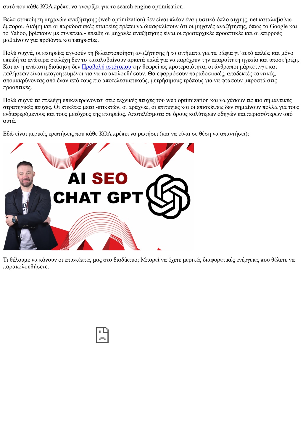 αυτό που κάθε ΚΟΑ πρέπει να γνωρίζει για το search engine optimisation Βελτιστοποίηση μηχανών αναζήτησης (web optimization) δεν είναι πλέον ένα μυστικό όπλο αιχμής, net καταλαβαίνω έμποροι. Ακόμη και οι παραδοσιακές εταιρείες πρέπει να διασφαλίσουν ότι οι μηχανές αναζήτησης, όπως το Google και το Yahoo, βρίσκουν με συνέπεια - επειδή οι μηχανές αναζήτησης είναι οι πρωταρχικές προοπτικές και οι επιρροές μαθαίνουν για προϊόντα και υπηρεσίες. Πολύ συχνά, οι εταιρείες αγνοούν τη βελτιστοποίηση αναζήτησης ή τα αιτήματα για τα ράφια γι 'αυτό απλώς και μόνο επειδή τα ανώτερα στελέχη δεν το καταλαβαίνουν αρκετά καλά για να παρέχουν την απαραίτητη ηγεσία και υποστήριξη. Και αν η ανώτατη διοίκηση δεν Προβολή ιστότοπου την θεωρεί ως προτεραιότητα, οι άνθρωποι μάρκετινγκ και πωλήσεων είναι απογοητευμένοι για να το ακολουθήσουν. Θα εφαρμόσουν παραδοσιακές, αποδεκτές τακτικές, απομακρύνοντας από έναν από τους πιο αποτελεσματικούς, μετρήσιμους τρόπους για να φτάσουν μπροστά στις προοπτικές. Πολύ συχνά τα στελέχη επικεντρώνονται στις τεχνικές πτυχές του web optimization και να χάσουν τις πιο σημαντικές στρατηγικές πτυχές. Οι ετικέτες μετα -ετικετών, οι αράχνες, οι επιτυχίες και οι επισκέψεις δεν σημαίνουν πολλά για τους ενδιαφερόμενους και τους μετόχους της εταιρείας. Αποτελέσματα σε όρους καλύτερων οδηγών και περισσότερων από αυτά. Εδώ είναι μερικές ερωτήσεις που κάθε ΚΟΑ πρέπει να ρωτήσει (και να είναι σε θέση να απαντήσει): Τι θέλουμε να κάνουν οι επισκέπτες μας στο διαδίκτυο; Μπορεί να έχετε μερικές διαφορετικές ενέργειες που θέλετε να παρακολουθήσετε.