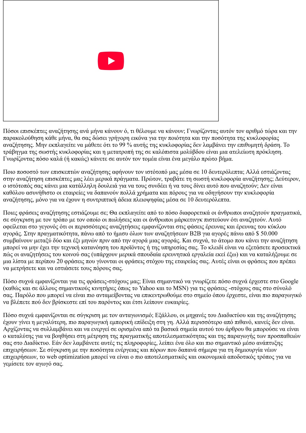 Πόσοι επισκέπτες αναζήτησης ανά μήνα κάνουν ό, τι θέλουμε να κάνουν; Γνωρίζοντας αυτόν τον αριθμό τώρα και την παρακολούθηση κάθε μήνα, θα σας δώσει γρήγορη εικόνα για την ποιότητα και την ποσότητα της κυκλοφορίας αναζήτησης. Μην εκπλαγείτε να μάθετε ότι το 99 % αυτής της κυκλοφορίας δεν λαμβάνει την επιθυμητή δράση. Το τράβηγμα της σωστής κυκλοφορίας και η μετατροπή της σε καλόπιστα μολύβδου είναι μια ατελείωτη πρόκληση. Γνωρίζοντας πόσο καλά (ή κακώς) κάνετε σε αυτόν τον τομέα είναι ένα μεγάλο πρώτο βήμα. Ποιο ποσοστό των επισκεπτών αναζήτησης αφήνουν τον ιστότοπό μας μέσα σε 10 δευτερόλεπτα; Αλλά εστιάζοντας στην αναζήτηση επισκέπτες μας λέει μερικά πράγματα. Πρώτον, τραβάτε τη σωστή κυκλοφορία αναζήτησης; Δεύτερον, ο ιστότοπός σας κάνει μια κατάλληλη δουλειά για να τους συνδέει ή να τους δίνει αυτό που αναζητούν; Δεν είναι καθόλου ασυνήθιστο οι εταιρείες να δαπανούν πολλά χρήματα και πόρους για να οδηγήσουν την κυκλοφορία αναζήτησης, μόνο για να έχουν η συντριπτική άδεια πλειοψηφίας μέσα σε 10 δευτερόλεπτα. Ποιες φράσεις αναζήτησης εστιάζουμε σε; Θα εκπλαγείτε από το πόσο διαφορετικά οι άνθρωποι αναζητούν πραγματικά, σε σύγκριση με τον τρόπο με τον οποίο οι πωλήσεις και οι άνθρωποι μάρκετινγκ πιστεύουν ότι αναζητούν. Αυτό οφείλεται στο γεγονός ότι οι περισσότερες αναζητήσεις εμφανίζονται στις φάσεις έρευνας και έρευνας του κύκλου αγοράς. Στην πραγματικότητα, πάνω από το ήμισυ όλων των αναζητήσεων B2B για αγορές πάνω από $ 50.000 συμβαίνουν μεταξύ δύο και έξι μηνών πριν από την αγορά μιας αγοράς. Και συχνά, το άτομο που κάνει την αναζήτηση μπορεί να μην έχει την τεχνική κατανόηση του προϊόντος ή της υπηρεσίας σας. Το κλειδί είναι να εξετάσετε προσεκτικά πώς οι αναζητήσεις του κοινού σας (υπάρχουν μερικά σπουδαία ερευνητικά εργαλεία εκεί έξω) και να καταλήξουμε σε μια λίστα με περίπου 20 φράσεις που γίνονται οι φράσεις στόχου της εταιρείας σας. Αυτές είναι οι φράσεις που πρέπει να μετρήσετε και να εστιάσετε τους πόρους σας. Πόσο συχνά εμφανίζονται για τις φράσεις-στόχους μας; Είναι σημαντικό να γνωρίζετε πόσο συχνά έρχεστε στο Google (καθώς και σε άλλους σημαντικούς κινητήρες όπως το Yahoo και το MSN) για τις φράσεις -στόχους σας στο σύνολό σας. Παρόλο που μπορεί να είναι πιο ανταμείβοντας να επικεντρωθούμε στο σημείο όπου έρχεστε, είναι πιο παραγωγικό να βλέπετε πού δεν βρίσκεστε επί του παρόντος και έτσι λείπουν ευκαιρίες. Πόσο συχνά εμφανίζονται σε σύγκριση με τον ανταγωνισμό; Εξάλλου, οι μηχανές του Διαδικτύου και της αναζήτησης έχουν γίνει η μεγαλύτερη, πιο παραγωγική εμπορική επίδειξη στη γη. Αλλά περισσότερο από πιθανό, κανείς δεν είναι. Αρχίζοντας να συλλαμβάνει και να ενεργεί σε ορισμένα από τα βασικά σημεία αυτού του άρθρου θα μπορούσε να είναι ο καταλύτης για να βοηθήσει στη μέτρηση της πραγματικής αποτελεσματικότητας και της παραγωγής των προσπαθειών σας στο Διαδίκτυο. Εάν δεν λαμβάνετε αυτές τις πληροφορίες, λείπει ένα όλο και πιο σημαντικό μέσο ανάπτυξης επιχειρήσεων. Σε σύγκριση με την ποσότητα ενέργειας και πόρων που δαπανά σήμερα για τη δημιουργία νέων επιχειρήσεων, το web optimization μπορεί να είναι ο πιο αποτελεσματικός και οικονομικά αποδοτικός τρόπος για να γεμίσετε τον αγωγό σας.