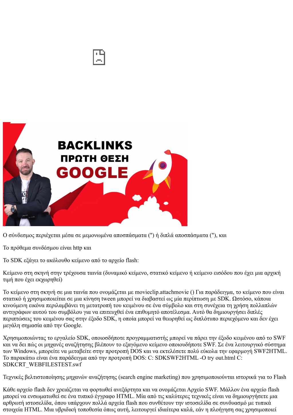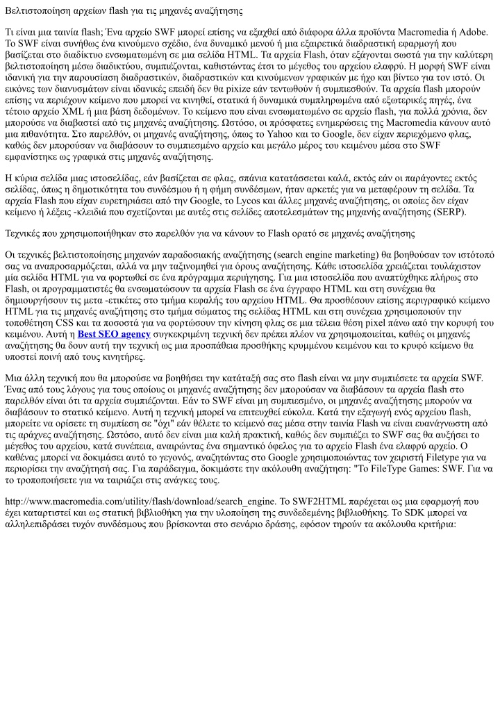 Ο σύνδεσμος περιέχεται μέσα σε μεμονωμένα αποσπάσματα ('') ή διπλά αποσπάσματα ("), και Το πρόθεμα συνδέσμου είναι http και Το SDK εξάγει το ακόλουθο κείμενο από το αρχείο flash: Κείμενο στη σκηνή στην τρέχουσα ταινία (δυναμικό κείμενο, στατικό κείμενο ή κείμενο εισόδου που έχει μια αρχική τιμή που έχει εκχωρηθεί) Το κείμενο στη σκηνή σε μια ταινία που ονομάζεται με movieclip.attachmovie () Για παράδειγμα, το κείμενο που είναι στατικό ή χρησιμοποιείται σε μια κίνηση tween μπορεί να διαβαστεί ως μία περίπτωση με SDK. Ωστόσο, κάποια κινούμενη εικόνα περιλαμβάνει τη μετατροπή του κειμένου σε ένα σύμβολο και στη συνέχεια τη χρήση πολλαπλών αντιγράφων αυτού του συμβόλου για να επιτευχθεί ένα επιθυμητό αποτέλεσμα. Αυτό θα δημιουργήσει διπλές περιπτώσεις του κειμένου σας στην έξοδο SDK, η οποία μπορεί να θεωρηθεί ως διπλότυπο περιεχόμενο και δεν έχει μεγάλη σημασία από την Google. Χρησιμοποιώντας το εργαλείο SDK, οποιοσδήποτε προγραμματιστής μπορεί να πάρει την έξοδο κειμένου από το SWF και να δει πώς οι μηχανές αναζήτησης βλέπουν το εξαγόμενο κείμενο οποιουδήποτε SWF. Σε ένα λειτουργικό σύστημα των Windows, μπορείτε να μεταβείτε στην προτροπή DOS και να εκτελέσετε πολύ εύκολα την εφαρμογή SWF2HTML. Το παρακάτω είναι ένα παράδειγμα από την προτροπή DOS: C: SDKSWF2HTML -O try out.html C: SDKCRT_WEBFILESTEST.swf Τεχνικές βελτιστοποίησης μηχανών αναζήτησης (search engine marketing) που χρησιμοποιούνται ιστορικά για το Flash Κάθε αρχείο flash δεν χρειάζεται να φορτωθεί ανεξάρτητα και να ονομάζεται Αρχείο SWF. Μάλλον ένα αρχείο flash μπορεί να ενσωματωθεί σε ένα τυπικό έγγραφο HTML. Μία από τις καλύτερες τεχνικές είναι να δημιουργήσετε μια αρθρωτή ιστοσελίδα, όπου υπάρχουν πολλά αρχεία flash που συνθέτουν την ιστοσελίδα σε συνδυασμό με τυπικά στοιχεία HTML. Μια υβριδική τοποθεσία όπως αυτή, λειτουργεί ιδιαίτερα καλά, εάν η πλοήγηση σας χρησιμοποιεί