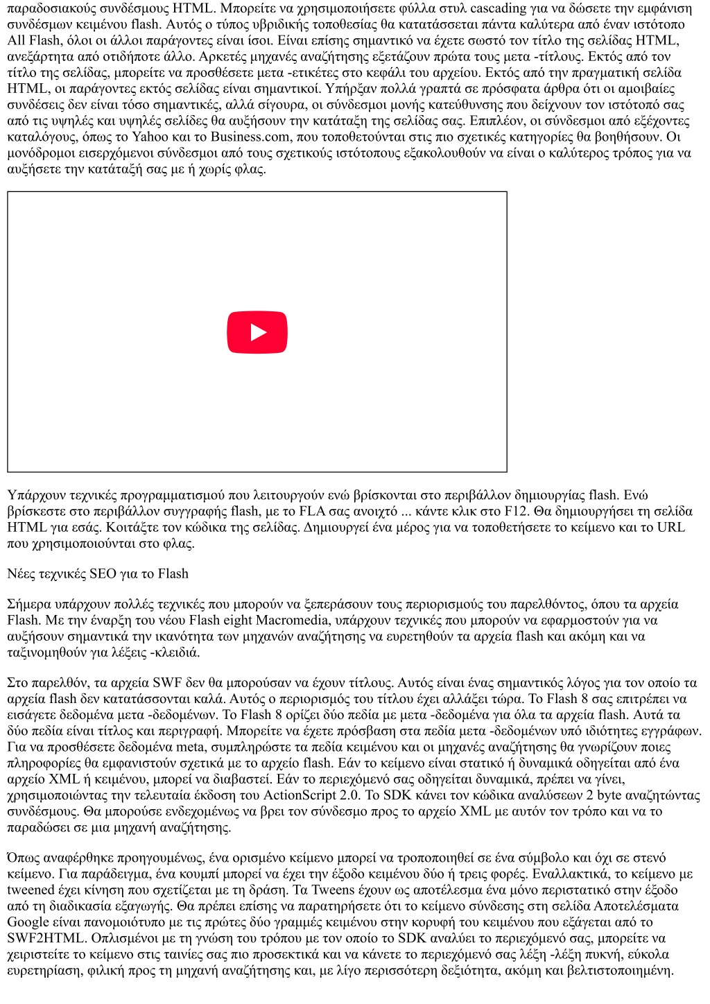παραδοσιακούς συνδέσμους HTML. Μπορείτε να χρησιμοποιήσετε φύλλα στυλ cascading για να δώσετε την εμφάνιση συνδέσμων κειμένου flash. Αυτός ο τύπος υβριδικής τοποθεσίας θα κατατάσσεται πάντα καλύτερα από έναν ιστότοπο All Flash, όλοι οι άλλοι παράγοντες είναι ίσοι. Είναι επίσης σημαντικό να έχετε σωστό τον τίτλο της σελίδας HTML, ανεξάρτητα από οτιδήποτε άλλο. Αρκετές μηχανές αναζήτησης εξετάζουν πρώτα τους μετα -τίτλους. Εκτός από τον τίτλο της σελίδας, μπορείτε να προσθέσετε μετα -ετικέτες στο κεφάλι του αρχείου. Εκτός από την πραγματική σελίδα HTML, οι παράγοντες εκτός σελίδας είναι σημαντικοί. Υπήρξαν πολλά γραπτά σε πρόσφατα άρθρα ότι οι αμοιβαίες συνδέσεις δεν είναι τόσο σημαντικές, αλλά σίγουρα, οι σύνδεσμοι μονής κατεύθυνσης που δείχνουν τον ιστότοπό σας από τις υψηλές και υψηλές σελίδες θα αυξήσουν την κατάταξη της σελίδας σας. Επιπλέον, οι σύνδεσμοι από εξέχοντες καταλόγους, όπως το Yahoo και το Business.com, που τοποθετούνται στις πιο σχετικές κατηγορίες θα βοηθήσουν. Οι μονόδρομοι εισερχόμενοι σύνδεσμοι από τους σχετικούς ιστότοπους εξακολουθούν να είναι ο καλύτερος τρόπος για να αυξήσετε την κατάταξή σας με ή χωρίς φλας. Υπάρχουν τεχνικές προγραμματισμού που λειτουργούν ενώ βρίσκονται στο περιβάλλον δημιουργίας flash. Ενώ βρίσκεστε στο περιβάλλον συγγραφής flash, με το FLA σας ανοιχτό ... κάντε κλικ στο F12. Θα δημιουργήσει τη σελίδα HTML για εσάς. Κοιτάξτε τον κώδικα της σελίδας. Δημιουργεί ένα μέρος για να τοποθετήσετε το κείμενο και το URL που χρησιμοποιούνται στο φλας. Νέες τεχνικές SEO για το Flash Σήμερα υπάρχουν πολλές τεχνικές που μπορούν να ξεπεράσουν τους περιορισμούς του παρελθόντος, όπου τα αρχεία Flash. Με την έναρξη του νέου Flash eight Macromedia, υπάρχουν τεχνικές που μπορούν να εφαρμοστούν για να αυξήσουν σημαντικά την ικανότητα των μηχανών αναζήτησης να ευρετηθούν τα αρχεία flash και ακόμη και να ταξινομηθούν για λέξεις -κλειδιά. Στο παρελθόν, τα αρχεία SWF δεν θα μπορούσαν να έχουν τίτλους. Αυτός είναι ένας σημαντικός λόγος για τον οποίο τα αρχεία flash δεν κατατάσσονται καλά. Αυτός ο περιορισμός του τίτλου έχει αλλάξει τώρα. Το Flash 8 σας επιτρέπει να εισάγετε δεδομένα μετα -δεδομένων. Το Flash 8 ορίζει δύο πεδία με μετα -δεδομένα για όλα τα αρχεία flash. Αυτά τα δύο πεδία είναι τίτλος και περιγραφή. Μπορείτε να έχετε πρόσβαση στα πεδία μετα -δεδομένων υπό ιδιότητες εγγράφων. Για να προσθέσετε δεδομένα meta, συμπληρώστε τα πεδία κειμένου και οι μηχανές αναζήτησης θα γνωρίζουν ποιες πληροφορίες θα εμφανιστούν σχετικά με το αρχείο flash. Εάν το κείμενο είναι στατικό ή δυναμικά οδηγείται από ένα αρχείο XML ή κειμένου, μπορεί να διαβαστεί. Εάν το περιεχόμενό σας οδηγείται δυναμικά, πρέπει να γίνει, χρησιμοποιώντας την τελευταία έκδοση του ActionScript 2.0. Το SDK κάνει τον κώδικα αναλύσεων 2 byte αναζητώντας συνδέσμους. Θα μπορούσε ενδεχομένως να βρει τον σύνδεσμο προς το αρχείο XML με αυτόν τον τρόπο και να το παραδώσει σε μια μηχανή αναζήτησης. Όπως αναφέρθηκε προηγουμένως, ένα ορισμένο κείμενο μπορεί να τροποποιηθεί σε ένα σύμβολο και όχι σε στενό κείμενο. Για παράδειγμα, ένα κουμπί μπορεί να έχει την έξοδο κειμένου δύο ή τρεις φορές. Εναλλακτικά, το κείμενο με tweened έχει κίνηση που σχετίζεται με τη δράση. Τα Tweens έχουν ως αποτέλεσμα ένα μόνο περιστατικό στην έξοδο από τη διαδικασία εξαγωγής. Θα πρέπει επίσης να παρατηρήσετε ότι το κείμενο σύνδεσης στη σελίδα Αποτελέσματα Google είναι πανομ