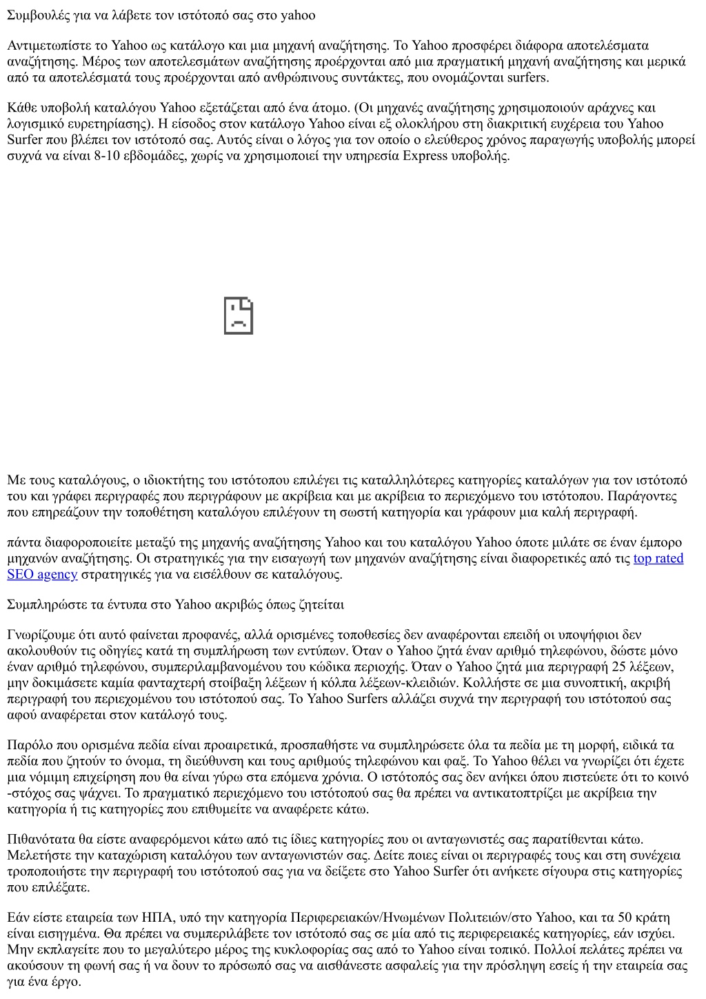 Συμβουλές για να λάβετε τον ιστότοπό σας στο yahoo Αντιμετωπίστε το Yahoo ως κατάλογο και μια μηχανή αναζήτησης. Το Yahoo προσφέρει διάφορα αποτελέσματα αναζήτησης. Μέρος των αποτελεσμάτων αναζήτησης προέρχονται από μια πραγματική μηχανή αναζήτησης και μερικά από τα αποτελέσματά τους προέρχονται από ανθρώπινους συντάκτες, που ονομάζονται surfers. Κάθε υποβολή καταλόγου Yahoo εξετάζεται από ένα άτομο. (Οι μηχανές αναζήτησης χρησιμοποιούν αράχνες και λογισμικό ευρετηρίασης). Η είσοδος στον κατάλογο Yahoo είναι εξ ολοκλήρου στη διακριτική ευχέρεια του Yahoo Surfer που βλέπει τον ιστότοπό σας. Αυτός είναι ο λόγος για τον οποίο ο ελεύθερος χρόνος παραγωγής υποβολής μπορεί συχνά να είναι 8-10 εβδομάδες, χωρίς να χρησιμοποιεί την υπηρεσία Express υποβολής. Με τους καταλόγους, ο ιδιοκτήτης του ιστότοπου επιλέγει τις καταλληλότερες κατηγορίες καταλόγων για τον ιστότοπό του και γράφει περιγραφές που περιγράφουν με ακρίβεια και με ακρίβεια το περιεχόμενο του ιστότοπου. Παράγοντες που επηρεάζουν την τοποθέτηση καταλόγου επιλέγουν τη σωστή κατηγορία και γράφουν μια καλή περιγραφή. πάντα διαφοροποιείτε μεταξύ της μηχανής αναζήτησης Yahoo και του καταλόγου Yahoo όποτε μιλάτε σε έναν έμπορο μηχανών αναζήτησης. Οι στρατηγικές για την εισαγωγή των μηχανών αναζήτησης είναι διαφορετικές από τις top rated SEO agency στρατηγικές για να εισέλθουν σε καταλόγους. Συμπληρώστε τα έντυπα στο Yahoo ακριβώς όπως ζητείται Γνωρίζουμε ότι αυτό φαίνεται προφανές, αλλά ορισμένες τοποθεσίες δεν αναφέρονται επειδή οι υποψήφιοι δεν ακολουθούν τις οδηγίες κατά τη συμπλήρωση των εντύπων. Όταν ο Yahoo ζητά έναν αριθμό τηλεφώνου, δώστε μόνο έναν αριθμό τηλεφώνου, συμπεριλαμβανομένου του κώδικα περιοχής. Όταν ο Yahoo ζητά μια περιγραφή 25 λέξεων, μην δοκιμάσετε καμία φανταχτερή στοίβαξη λέξεων ή κόλπα λέξεων-κλειδιών. Κολλήστε σε μια συνοπτική, ακριβή περιγραφή του περιεχομένου του ιστότοπού σας. Το Yahoo Surfers αλλάζει συχνά την περιγραφή του ιστότοπού σας αφού αναφέρεται στον κατάλογό τους. Παρόλο που ορισμένα πεδία είναι προαιρετικά, προσπαθήστε να συμπληρώσετε όλα τα πεδία με τη μορφή, ειδικά τα πεδία που ζητούν το όνομα, τη διεύθυνση και τους αριθμούς τηλεφώνου και φαξ. Το Yahoo θέλει να γνωρίζει ότι έχετε μια νόμιμη επιχείρηση που θα είναι γύρω στα επόμενα χρόνια. Ο ιστότοπός σας δεν ανήκει όπου πιστεύετε ότι το κοινό -στόχος σας ψάχνει. Το πραγματικό περιεχόμενο του ιστότοπού σας θα πρέπει να αντικατοπτρίζει με ακρίβεια την κατηγορία ή τις κατηγορίες που επιθυμείτε να αναφέρετε κάτω. Πιθανότατα θα είστε αναφερόμενοι κάτω από τις ίδιες κατηγορίες που οι ανταγωνιστές σας παρατίθενται κάτω. Μελετήστε την καταχώριση καταλόγου των ανταγωνιστών σας. Δείτε ποιες είναι οι περιγραφές τους και στη συνέχεια τροποποιήστε την περιγραφή του ιστότοπού σας για να δείξετε στο Yahoo Surfer ότι ανήκετε σίγουρα στις κατηγορίες που επιλέξατε. Εάν είστε εταιρεία των ΗΠΑ, υπό την κατηγορία Περιφερειακών/Ηνωμένων Πολιτειών/στο Yahoo, και τα 50 κράτη είναι εισηγμένα. Θα πρέπει να συμπεριλάβετε τον ιστότοπό σας σε μία από τις περιφερειακές κατηγορίες, εάν ισχύει. Μην εκπλαγείτε που το μεγαλύτερο μέρος της κυκλοφορίας σας από το Yahoo είναι τοπικό. Πολλοί πελάτες πρέπει να ακούσουν τη φωνή σας ή να δουν το πρόσωπό σας να αισθάνεστε ασφαλείς για την πρόσληψη εσείς ή την εταιρεία σας για ένα έργο.