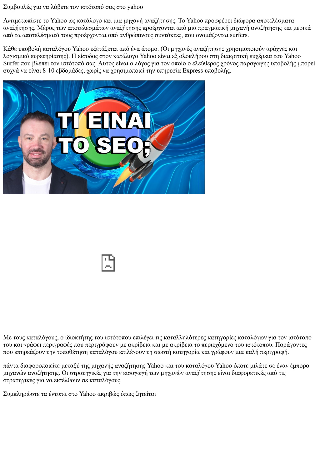 Οι εμπορικοί ιστότοποι πρέπει να καταβάλουν ετήσια αμοιβή ύψους 299 δολαρίων (επί του παρόντος) στον κατάλογο Yahoo. Μερικές φορές, ένα surfer Yahoo μπορεί να ανακαλύψει έναν πλούσιο σε περιεχόμενο εμπορικό ιστότοπο χωρίς να υποβάλετε ποτέ. "Σχεδιασμός για ταχύτητα" (προσφορά από ένα yahoo surfer) Το Yahoo ψάχνει για ιστότοπους που κατεβάζουν πολύ γρήγορα, κατά προτίμηση μέσα σε 30 δευτερόλεπτα σε ένα μόντεμ dial-up. Φυσικά, ισχύουν εξαιρέσεις. όπως αν είστε μια ηλεκτρονική εταιρεία βιντεοπαιχνιδιών και χρησιμοποιείτε το shockwave στον ιστότοπό σας. Τότε είναι κατανοητό ότι ο ιστότοπός σας μπορεί να διαρκέσει περισσότερο για λήψη. Τέλος, ο κανόνας "Περιεχόμενο είναι βασιλιάς" ισχύει για να καταχωρηθεί στο Yahoo. Εάν οι συντάκτες του Yahoo δεν αισθάνονται ότι ο ιστότοπός σας φαίνεται ή ακούγεται σαν μια νόμιμη επιχείρηση, δεν χρειάζεται να απαριθμήσουν τον ιστότοπό σας. Έτσι, βεβαιωθείτε ότι ο ιστότοπός σας είναι εύκολος στην ανάγνωση, εύκολη στην πλοήγηση, εύκολο στην εύρεση (στις μηχανές αναζήτησης), δείχνει συνέπεια στο σχεδιασμό και τη διάταξη και είναι γρήγορο να κατεβάσετε. Πάνω απ 'όλα, έχετε μοναδικό περιεχόμενο για να προσθέσετε αξία στον κατάλογο Yahoo.