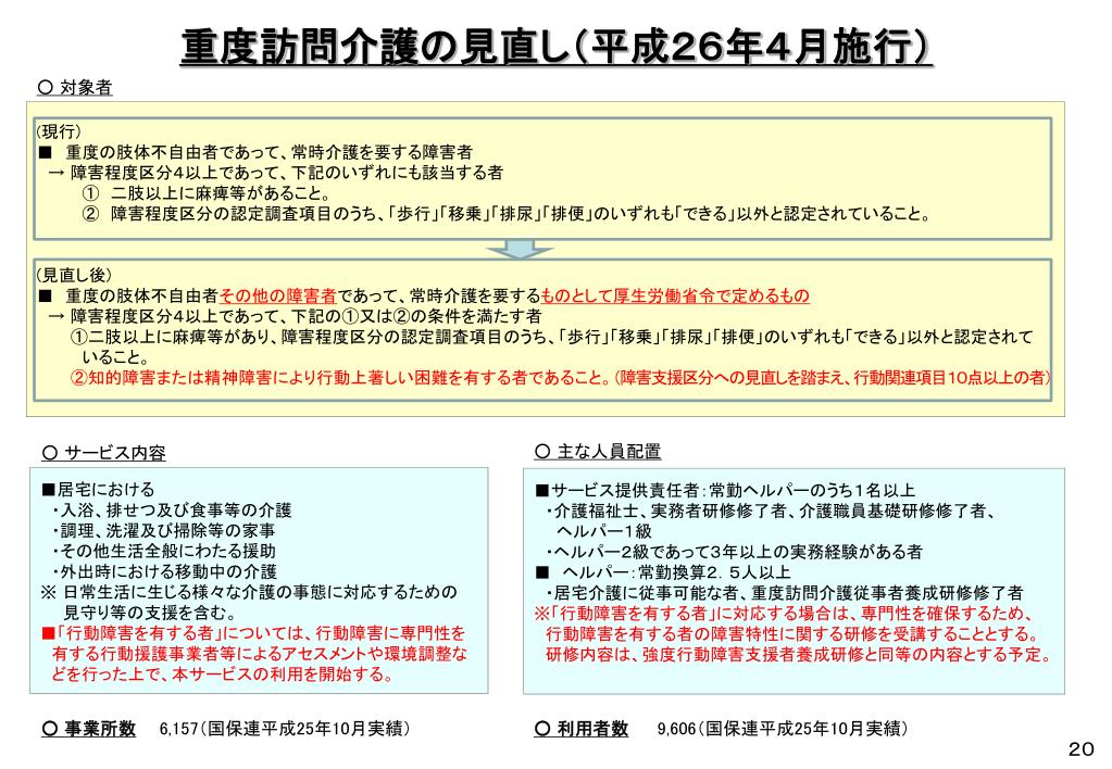 重度訪問介護の見直し(平成26年4月施行)重度訪問介護の見直し(平成26年4月施行) ○ 対象者 (現行) ■ 重度の肢体不自由者であって、常時介護を要する障害者 → 障害程度区分4以上であって、下記のいずれにも該当する者 ① 二肢以上に麻痺等があること。 ② 障害程度区分の認定調査項目のうち、「歩行」「移乗」「排尿」「排便」のいずれも「できる」以外と認定されていること。 (見直し後) ■ 重度の肢体不自由者その他の障害者であって、常時介護を要するものとして厚生労働省令で定めるもの → 障害程度区分4以上であって、下記の①又は②の条件を満たす者 ①二肢以上に麻痺等があり、障害程度区分の認定調査項目のうち、「歩行」「移乗」「排尿」「排便」のいずれも「できる」以外と認定されて いること。 ②知的障害または精神障害により行動上著しい困難を有する者であること。(障害支援区分への見直しを踏まえ、行動関連項目10点以上の者) ○ 主な人員配置 ○ サービス内容 ■居宅における ・入浴、排せつ及び食事等の介護 ・調理、洗濯及び掃除等の家事 ・その他生活全般にわたる援助 ・外出時における移動中の介護 ※ 日常生活に生じる様々な介護の事態に対応するための 見守り等の支援を含む。 ■「行動障害を有する者」については、行動障害に専門性を 有する行動援護事業者等によるアセスメントや環境調整な どを行った上で、本サービスの利用を開始する。 ■サービス提供責任者:常勤ヘルパーのうち1名以上 ・介護福祉士、実務者研修修了者、介護職員基礎研修修了者、 ヘルパー1級 ・ヘルパー2級であって3年以上の実務経験がある者 ■ ヘルパー:常勤換算2.5人以上 ・居宅介護に従事可能な者、重度訪問介護従事者養成研修修了者 ※「行動障害を有する者」に対応する場合は、専門性を確保するため、 行動障害を有する者の障害特性に関する研修を受講することとする。 研修内容は、強度行動障害支援者養成研修と同等の内容とする予定。 ○ 事業所数6,157(国保連平成25年10月実績) ○ 利用者数 9,606(国保連平成25年10月実績)