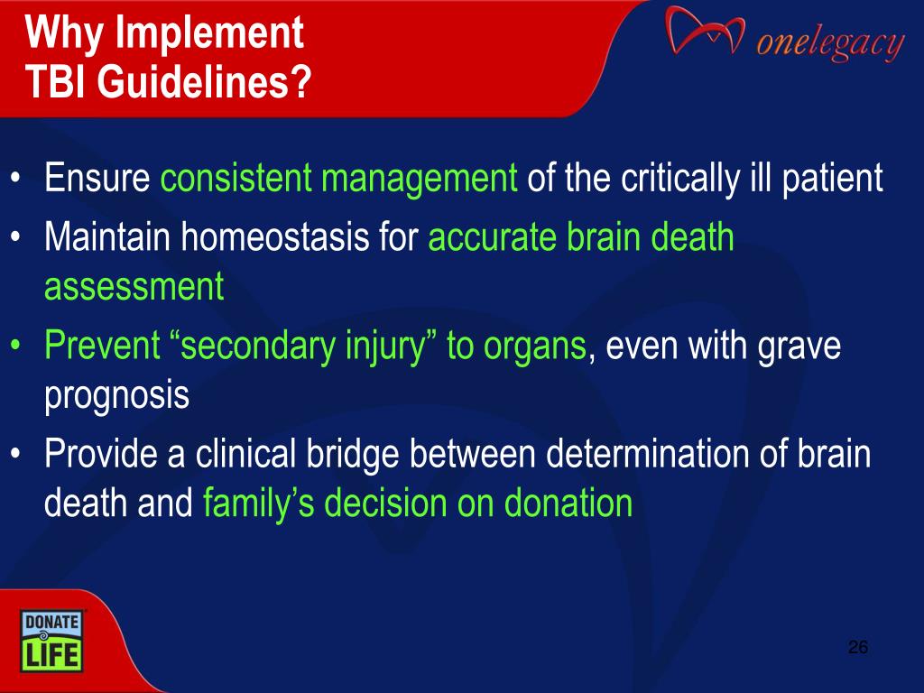Why Implement TBI Guidelines? • Ensure consistent management of the critically ill patient • Maintain homeostasis for accurate brain death assessment • Prevent “secondary injury” to organs, even with grave prognosis • Provide a clinical bridge between determination of brain death and family’s decision on donation