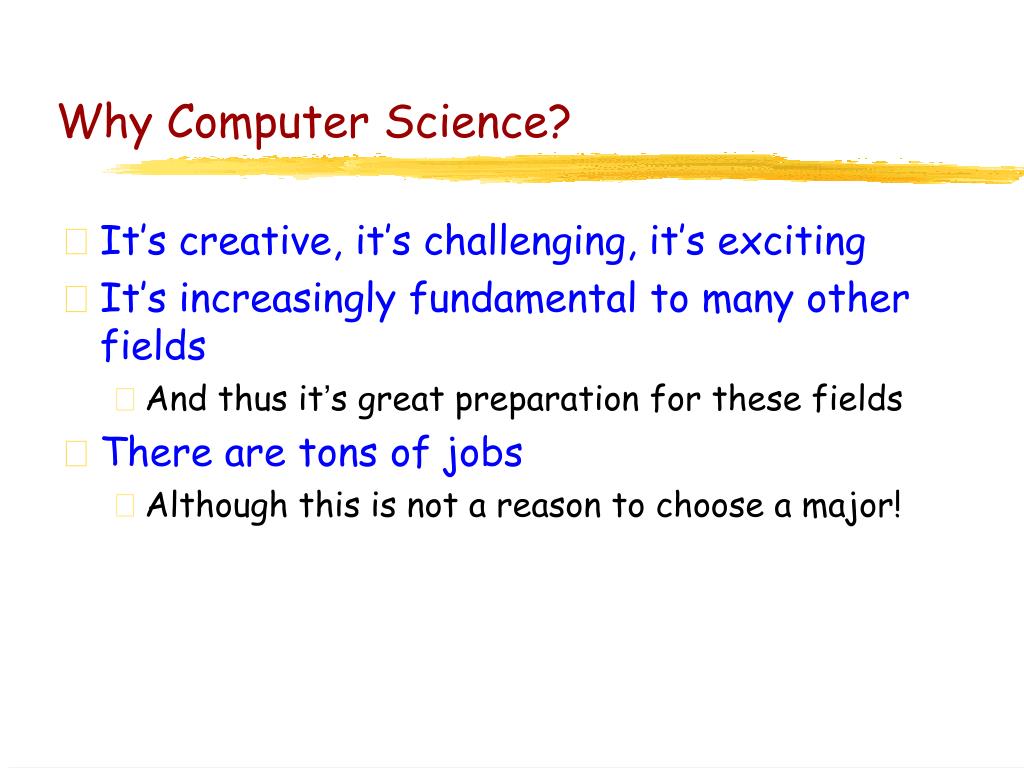 Why Computer Science? • It’s creative, it’schallenging, it’sexciting • It’sincreasingly fundamental to many other fields • And thus it’s great preparation for these fields • There are tons of jobs • Although this is not a reason to choose a major!