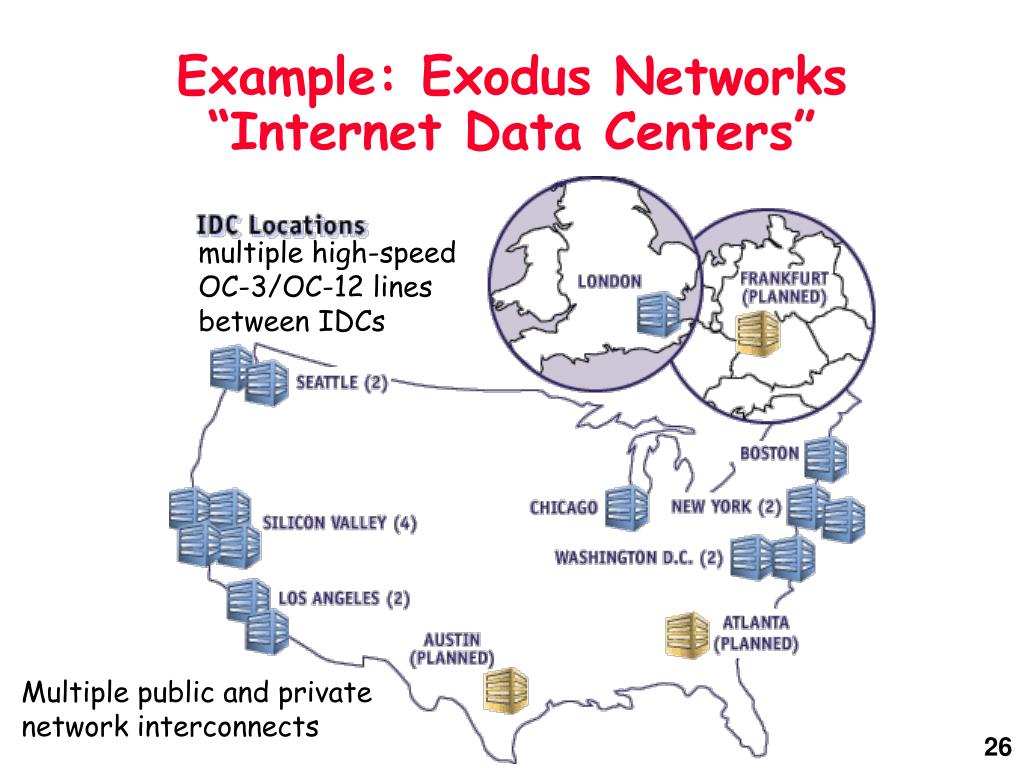 Example: Exodus Networks“Internet Data Centers” multiple high-speed OC-3/OC-12 lines between IDCs Multiple public and privatenetwork interconnects