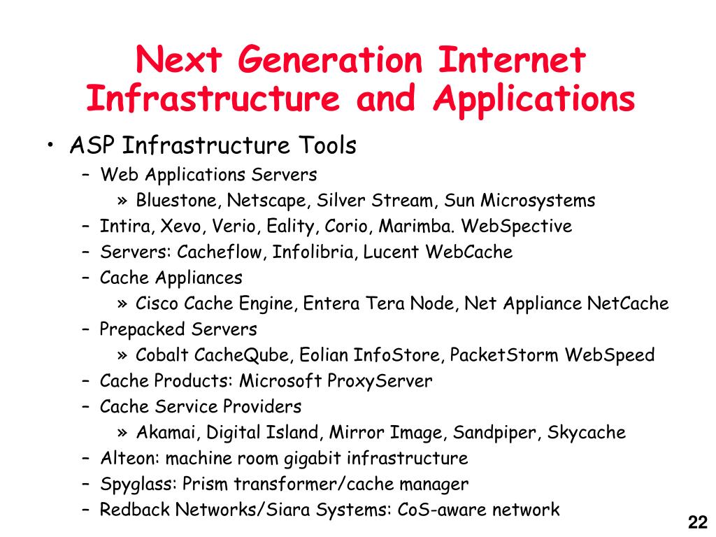 Next Generation Internet Infrastructure and Applications • ASP Infrastructure Tools • Web Applications Servers • Bluestone, Netscape, Silver Stream, Sun Microsystems • Intira, Xevo, Verio, Eality, Corio, Marimba. WebSpective • Servers: Cacheflow, Infolibria, Lucent WebCache • Cache Appliances • Cisco Cache Engine, Entera Tera Node, Net Appliance NetCache • Prepacked Servers • Cobalt CacheQube, Eolian InfoStore, PacketStorm WebSpeed • Cache Products: Microsoft ProxyServer • Cache Service Providers • Akamai, Digital Island, Mirror Image, Sandpiper, Skycache • Alteon: machine room gigabit infrastructure • Spyglass: Prism transformer/cache manager • Redback Networks/Siara Systems: CoS-aware network