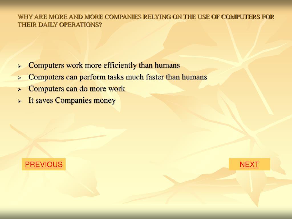 WHY ARE MORE AND MORE COMPANIES RELYING ON THE USE OF COMPUTERS FOR THEIR DAILY OPERATIONS? • Computers work more efficiently than humans • Computers can perform tasks much faster than humans • Computers can do more work • It saves Companies money PREVIOUS NEXT