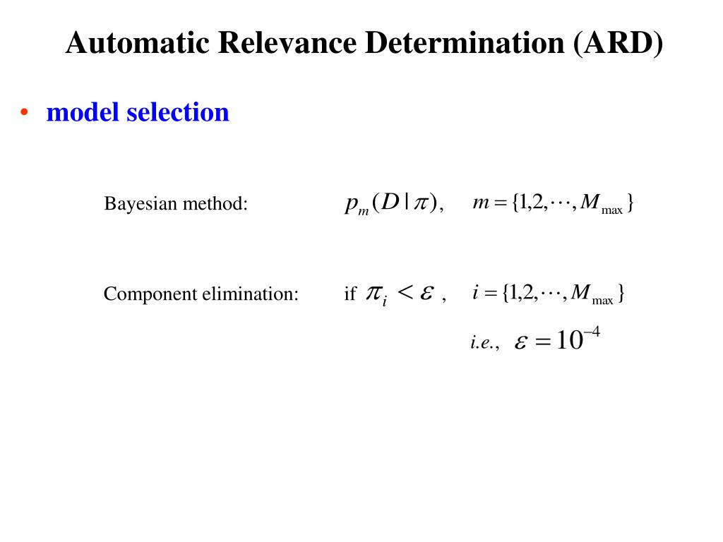 Automatic Relevance Determination (ARD) • model selection Bayesian method: , Component elimination: if , i.e.,