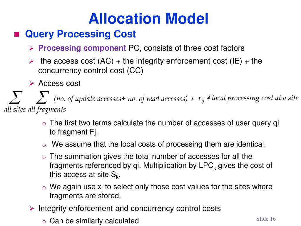 Total Cost Storage Cost (of fragment Fjat Sk) We choose a different approach in our model of the database allocation problem (DAP) and specify it as consisting of the processing cost (PC) and the transmission cost (TC). Thus the query processing cost (QPC) for application qi is: processing component + transmission component Allocation Model query processing cost (unit storage cost at Sk) (size of Fj) xjk all queries cost of storing a fragment at a site all sites all fragments