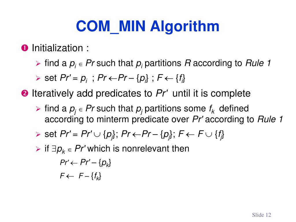 COM_MIN Algorithm • Initialization : • find a pi Prsuch that pi partitions R according to Rule 1 • set Pr' = pi ; PrPr– {pi}; F {fi} • Iteratively add predicates to Pr' until it is complete • find a pj Prsuch that pj partitions some fk defined according to minterm predicate over Pr' according to Rule 1 • set Pr' = Pr' {pj}; Pr Pr– {pj}; F F {fj} • if pk Pr' which is nonrelevant then Pr'Pr' – {pk} FF – {fk}