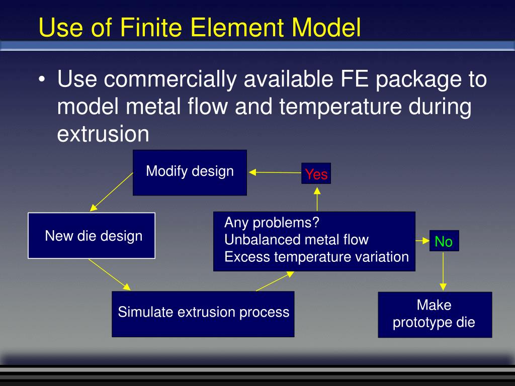 Use of Finite Element Model • Use commercially available FE package to model metal flow and temperature during extrusion Modify design Yes • Any problems? • Unbalanced metal flow • Excess temperature variation New die design No Make prototype die Simulate extrusion process