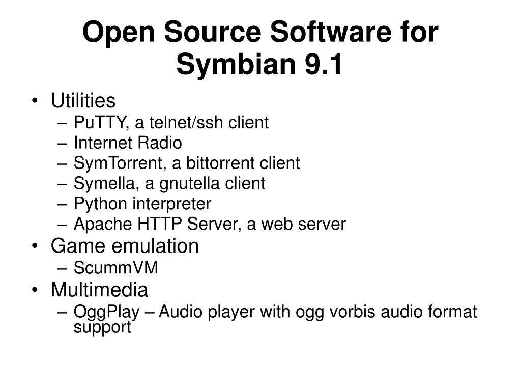 Open Source Software for Symbian 9.1 • Utilities • PuTTY, a telnet/ssh client • Internet Radio • SymTorrent, a bittorrent client • Symella, a gnutella client • Python interpreter • Apache HTTP Server, a web server • Game emulation • ScummVM • Multimedia • OggPlay – Audio player with ogg vorbis audio format support