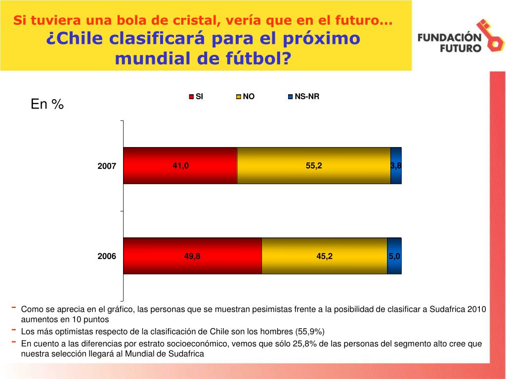 Si tuviera una bola de cristal, vería que en el futuro...¿Chile clasificará para el próximomundial de fútbol? En % • Como se aprecia en el gráfico, las personas que se muestran pesimistas frente a la posibilidad de clasificar a Sudafrica 2010 aumentos en 10 puntos • Los más optimistas respecto de la clasificación de Chile son los hombres (55,9%) • En cuento a las diferencias por estrato socioeconómico, vemos que sólo 25,8% de las personas del segmento alto cree que nuestra selección llegará al Mundial de Sudafrica