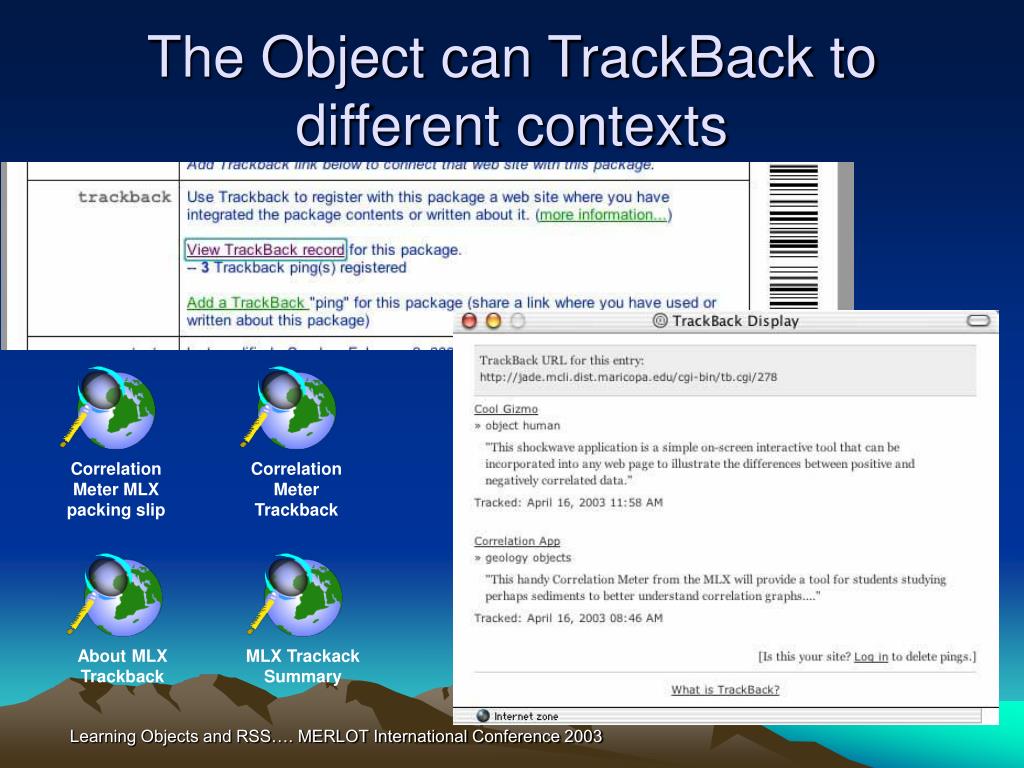 The Object can TrackBack to different contexts Correlation Meter MLX packing slip Correlation Meter Trackback About MLX Trackback MLX Trackack Summary Learning Objects and RSS…. MERLOT International Conference 2003