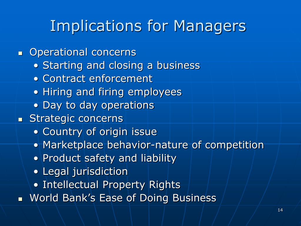 Implications for Managers • Operational concerns • Starting and closing a business • Contract enforcement • Hiring and firing employees • Day to day operations • Strategic concerns • Country of origin issue • Marketplace behavior-nature of competition • Product safety and liability • Legal jurisdiction • Intellectual Property Rights • World Bank’s Ease of Doing Business