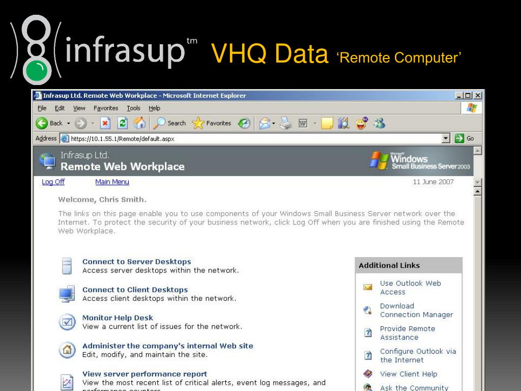 VHQ Data ‘Remote Computer’ Transparent to Clients Work Anywhere Use files like in a Office Fast and Reliable Spread the cost over 3 Years Free 24hr Support
