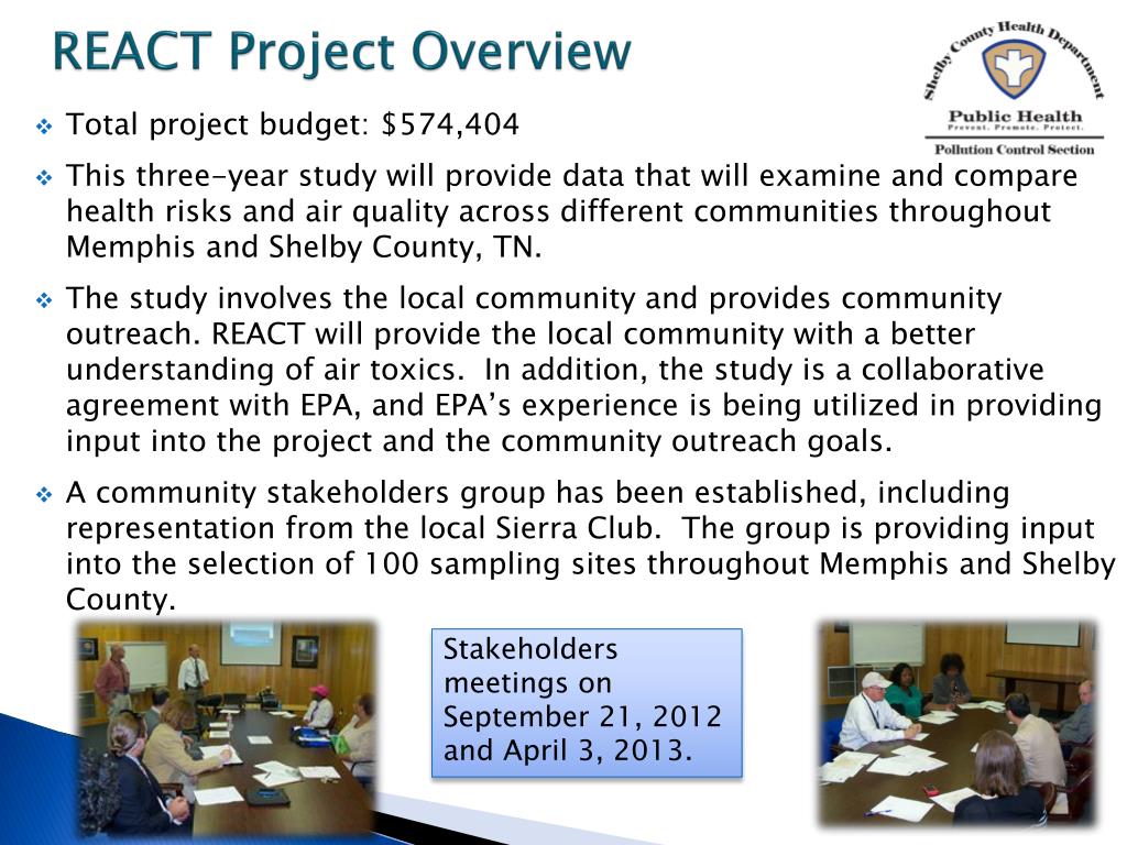REACT Project Overview • Total project budget: $574,404 • This three-year study will provide data that will examine and compare health risks and air quality across different communities throughout Memphis and Shelby County, TN. • The study involves the local community and provides community outreach. REACT will provide the local community with a better understanding of air toxics. In addition, the study is a collaborative agreement with EPA, and EPA’s experience is being utilized in providing input into the project and the community outreach goals. • A community stakeholders group has been established, including representation from the local Sierra Club. The group is providing input into the selection of 100 sampling sites throughout Memphis and Shelby County. Stakeholders meetings on September 21, 2012 and April 3, 2013.