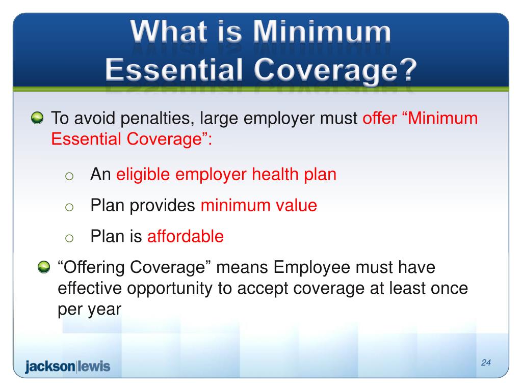 What is MinimumEssential Coverage? • To avoid penalties, large employer must offer “Minimum Essential Coverage”: • An eligible employer health plan • Plan provides minimum value • Plan is affordable • “Offering Coverage” means Employee must have effective opportunity to accept coverage at least once per year