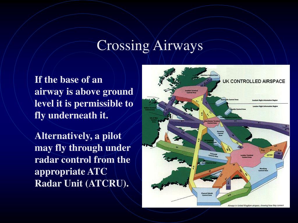 Crossing Airways If the base of an airway is above ground level it is permissible to fly underneath it. Alternatively, a pilot may fly through under radar control from the appropriate ATC Radar Unit (ATCRU).