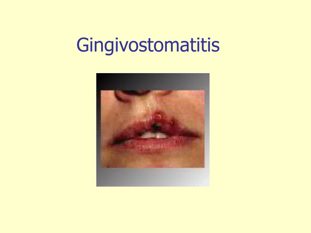 Oral-facial Herpes • Acute Gingivostomatitis • Acute gingivostomatitis is the commonest manifestation of primary herpetic infection. • The patient experiences pain and bleeding of the gums. 1 - 8 mm ulcers with necrotic bases are present. Neck glands are commonly enlarged accompanied by fever. • Usually a self limiting disease which lasts around 13 days. • Herpes labialis (cold sore) • Following primary infection, 45% of orally infected individuals will experience reactivation. The actual frequency of recurrences varies widely between individuals. • Herpes labialis (cold sore) is a recurrence of oral HSV. • A prodrome of tingling, warmth or itching at the site usually heralds the recurrence. About 12 hours later, redness appears followed by papules and then vesicles.