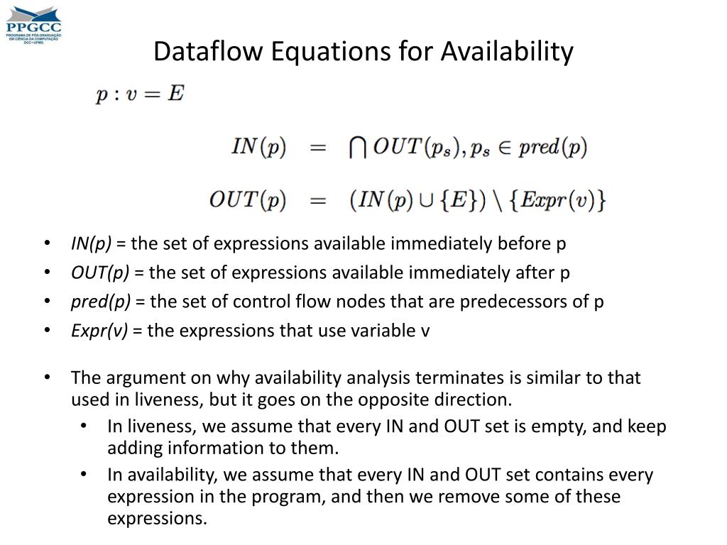 Dataflow Equations for Availability • IN(p) = the set of expressions available immediately before p • OUT(p) = the set of expressions available immediately after p • pred(p) = the set of control flow nodes that are predecessors of p • Expr(v) = the expressions that use variable v • The argument on why availability analysis terminates is similar to that used in liveness, but it goes on the opposite direction. • Inliveness, we assume that every IN and OUT set is empty, and keep adding information to them. • In availability, we assume that every IN and OUT set contains every expression in the program, and then we remove some of these expressions.
