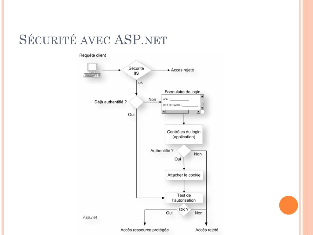 Sécurité sur Internet • ASP.net fonctionne en conjonction avec IIS(Microsoft Internet Information Services), ce couple peut identifier les utilisateurs par différentes méthodes comme le simple login (nom / mot de passe), ces méthodes sont : • Windows, Basic, digest, ou Integrated Windows Authentification (Kerberos); • Authentification par Microsoft Passport; • Authentification par formulaire; • Authentification par certificat d’utilisateur.