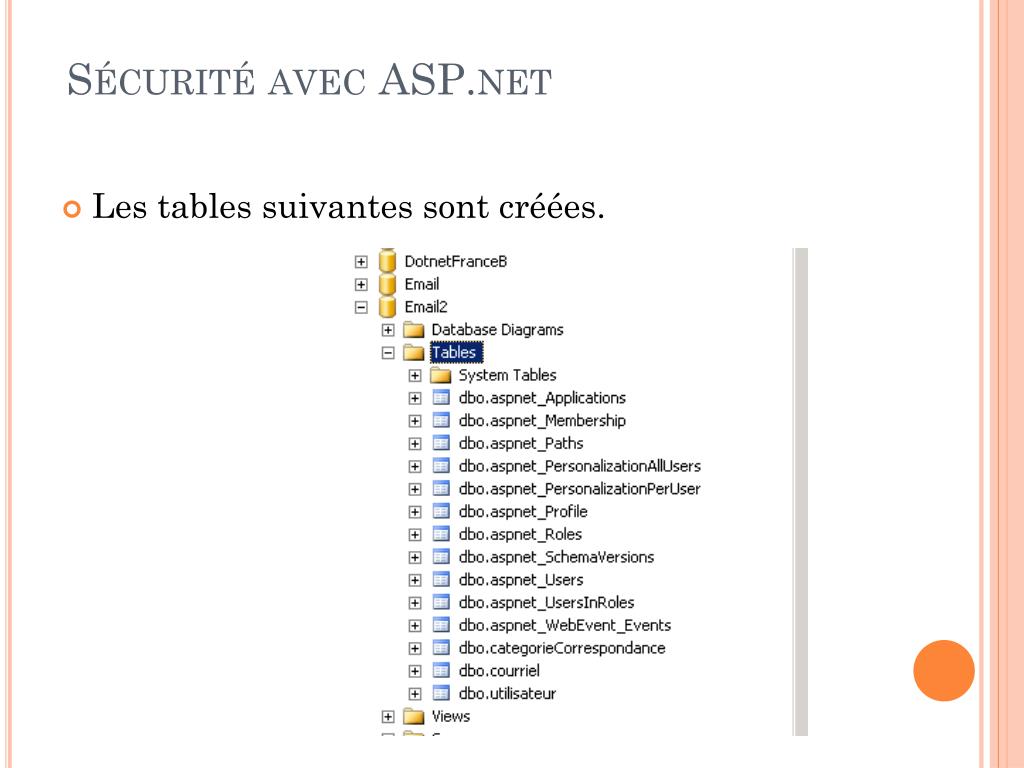 Sécurité avec ASP.net • Les tables suivantes sont créées.