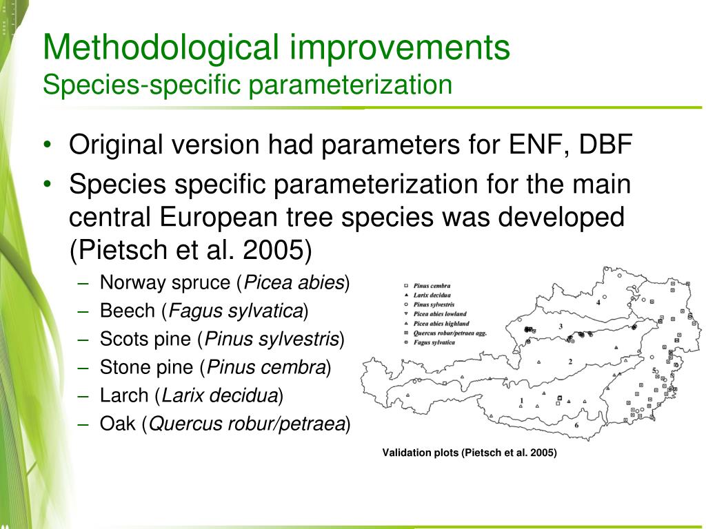 Methodological improvementsSpecies-specific parameterization • Original version had parameters for ENF, DBF • Species specific parameterization for the main central European tree species was developed (Pietsch et al. 2005) • Norway spruce (Picea abies) • Beech (Fagus sylvatica) • Scots pine (Pinus sylvestris) • Stone pine (Pinus cembra) • Larch (Larix decidua) • Oak (Quercus robur/petraea) Validation plots (Pietsch et al. 2005)