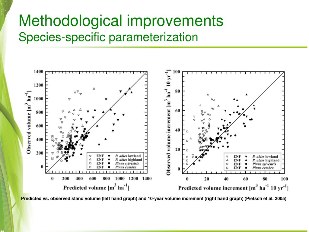 Methodological improvementsSpecies-specific parameterization Predicted vs. observed stand volume (left hand graph) and 10-year volume increment (right hand graph) (Pietsch et al. 2005)