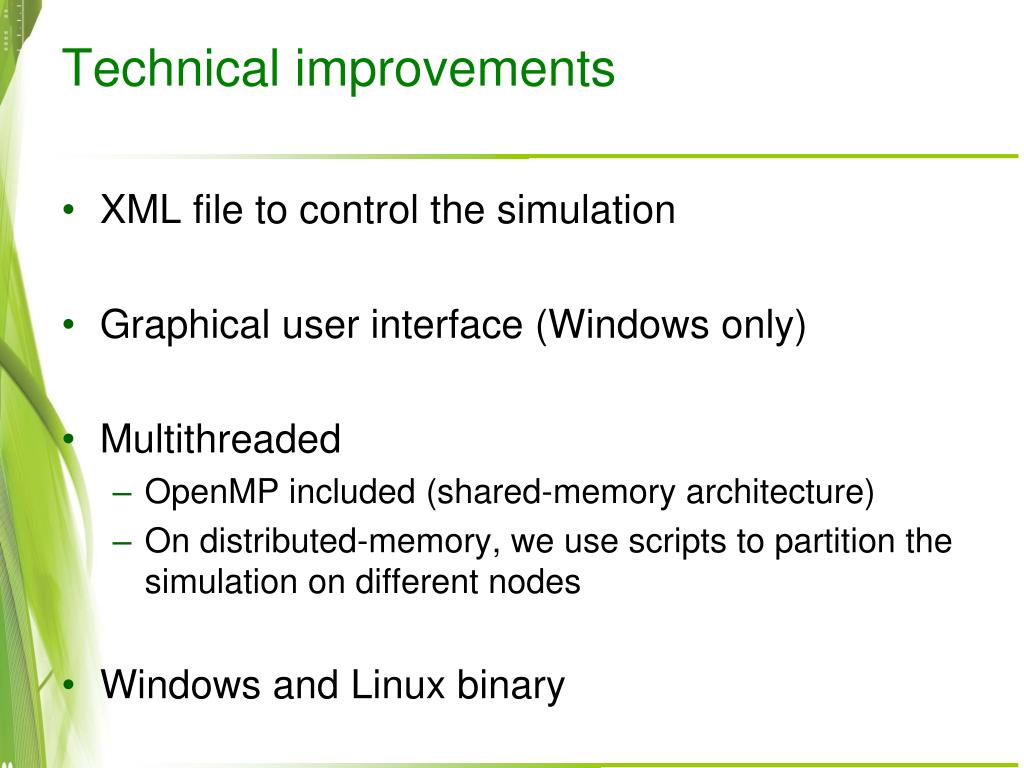 Technical improvements • XML file to control the simulation • Graphical user interface (Windows only) • Multithreaded • OpenMP included (shared-memory architecture) • On distributed-memory, we use scripts to partition the simulation on different nodes • Windows and Linux binary