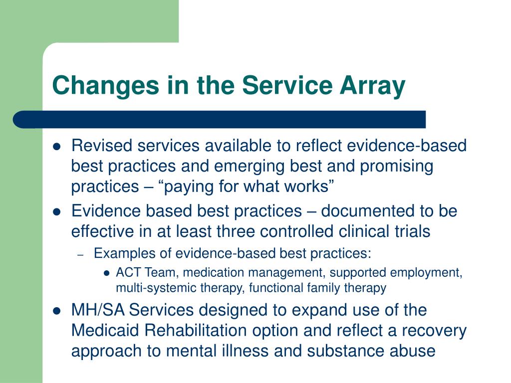 Changes in the Service Array • Revised services available to reflect evidence-based best practices and emerging best and promising practices – “paying for what works” • Evidence based best practices – documented to be effective in at least three controlled clinical trials • Examples of evidence-based best practices: • ACT Team, medication management, supported employment, multi-systemic therapy, functional family therapy • MH/SA Services designed to expand use of the Medicaid Rehabilitation option and reflect a recovery approach to mental illness and substance abuse