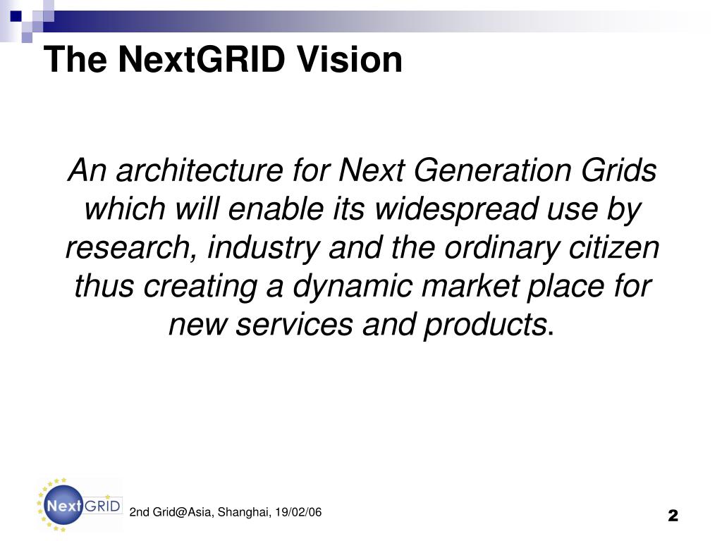 The NextGRID Vision An architecture for Next Generation Grids which will enable its widespread use by research, industry and the ordinary citizen thus creating a dynamic market place for new services and products. 2nd Grid@Asia, Shanghai, 19/02/06