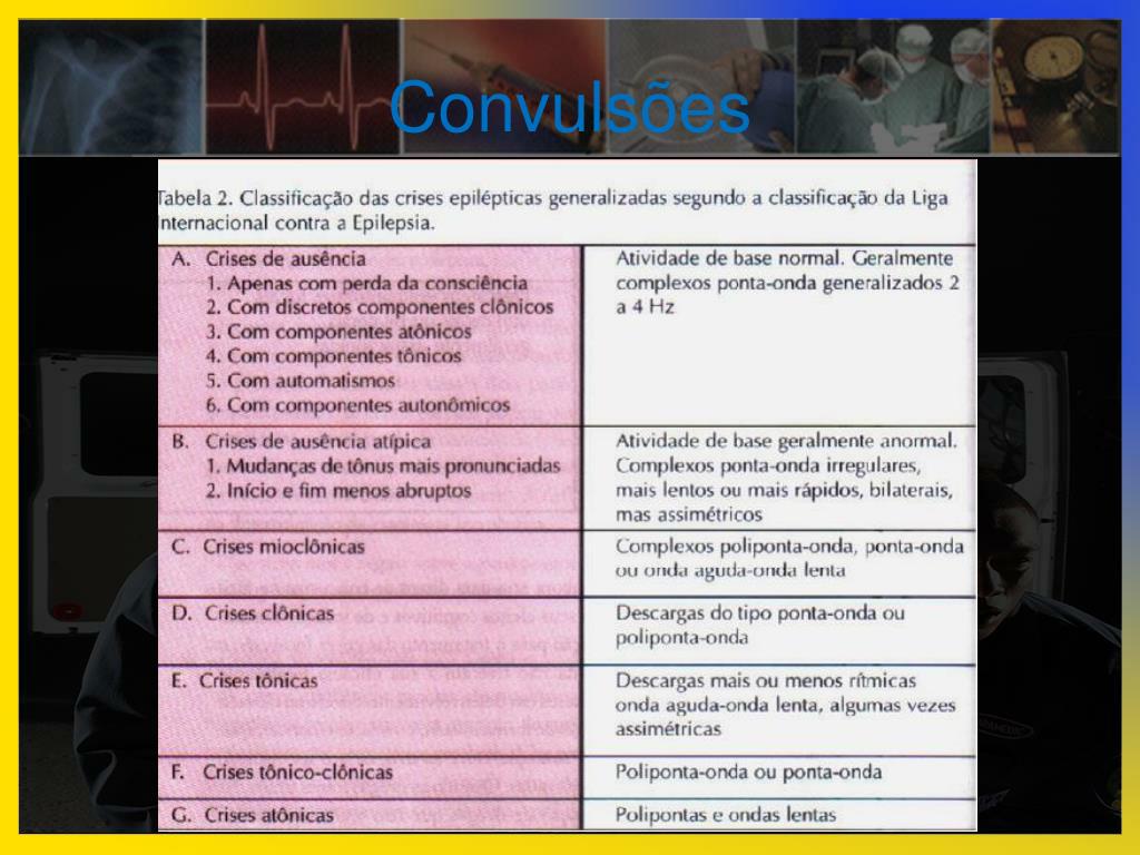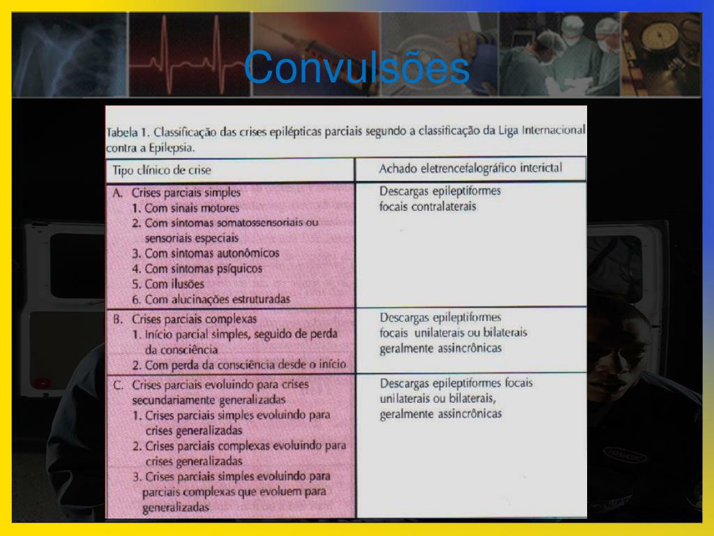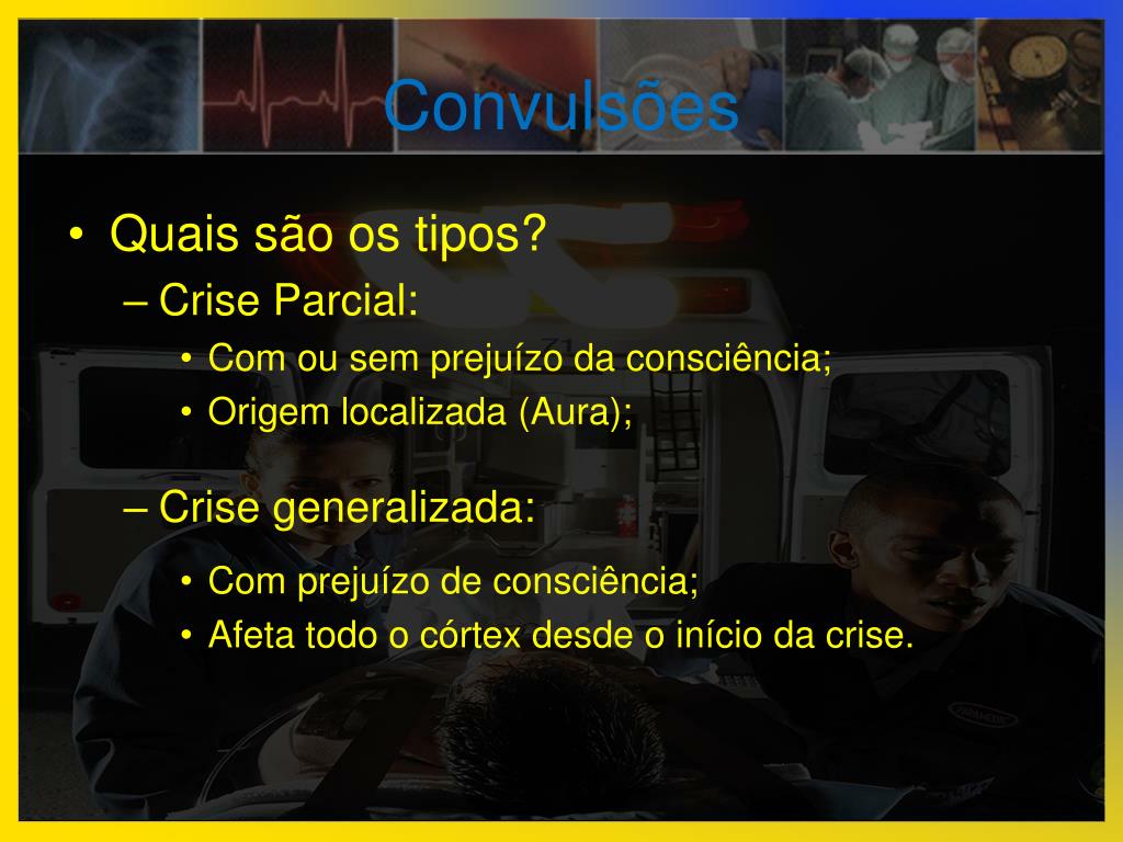 Convulsões • Quais são os tipos? • Crise Parcial: • Com ou sem prejuízo da consciência; • Origem localizada (Aura); • Crise generalizada: • Com prejuízo de consciência; • Afeta todo o córtex desde o início da crise.