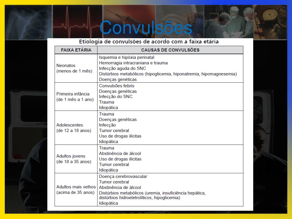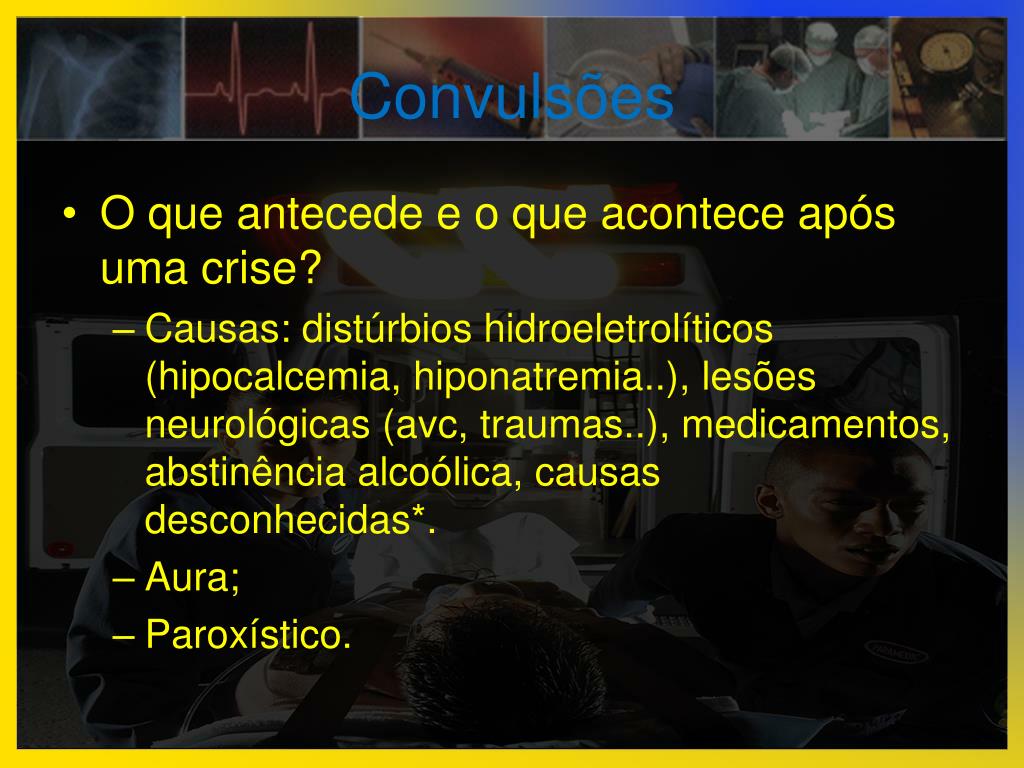 Convulsões • O que antecede e o que acontece após uma crise? • Causas: distúrbios hidroeletrolíticos (hipocalcemia, hiponatremia..), lesões neurológicas (avc, traumas..), medicamentos, abstinência alcoólica, causas desconhecidas*. • Aura; • Paroxístico.