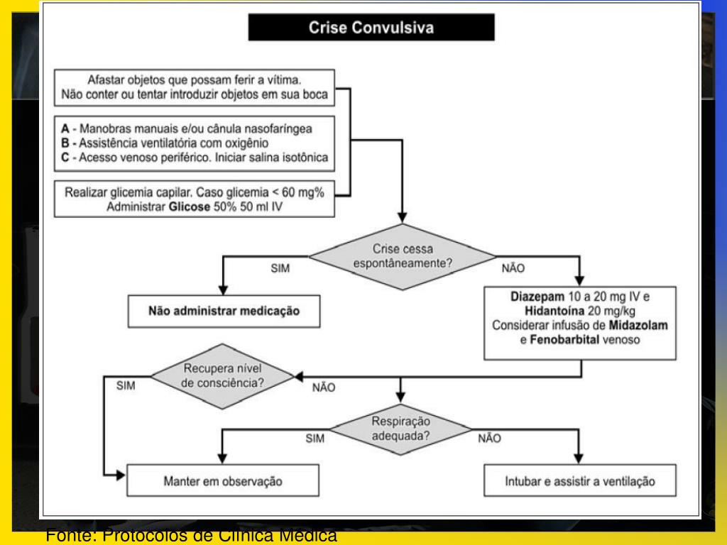 Conduta - Medicamentos • HIDANTALIZAR - Hidantal 20mg/Kg (ampola 250mg/5ml) - Diluído em 250-500ml de SF - Velocidade infusão 50mg/min - Problemas: hipotensão, arritmias - Recorrência da crise durante infusão do Hidantal pode fazer Diazepam • Ainda em crise após hidantalização, pode-se fazer novas doses de Hidantal de 5mg/Kg, respeitando máximo de 30mg/Kg (20 + 5 + 5) Monitorar PA e ECG*