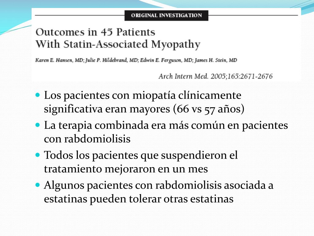 Los pacientes con miopatía clínicamente significativa eran mayores (66 vs 57 años) • La terapia combinada era más común en pacientes con rabdomiolisis • Todos los pacientes que suspendieron el tratamiento mejoraron en un mes • Algunos pacientes con rabdomiolisis asociada a estatinas pueden tolerar otras estatinas