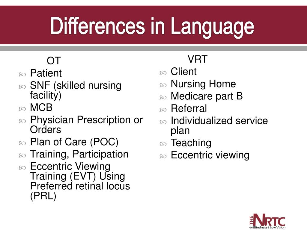 Differences in Language OT • Patient • SNF (skilled nursing facility) • MCB • Physician Prescription or Orders • Plan of Care (POC) • Training, Participation • Eccentric Viewing Training (EVT) Using Preferred retinal locus (PRL) VRT • Client • Nursing Home • Medicare part B • Referral • Individualized service plan • Teaching • Eccentric viewing