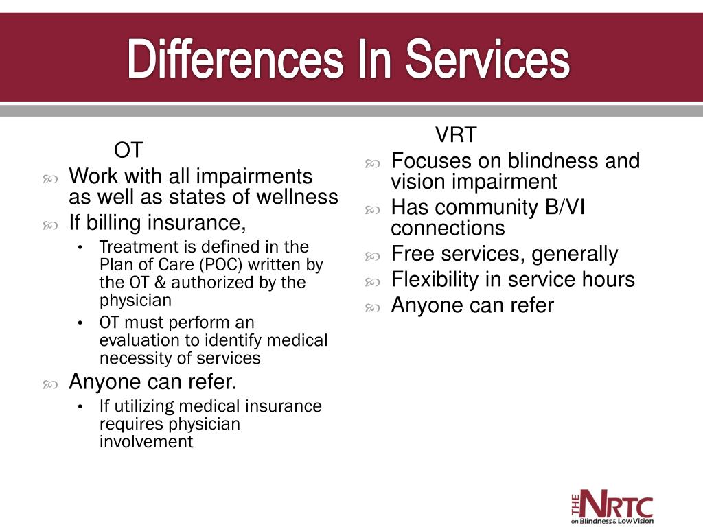 Differences In Services OT • Work with all impairments as well as states of wellness • If billing insurance, • Treatment is defined in the Plan of Care (POC) written by the OT & authorized by the physician • OT must perform an evaluation to identify medical necessity of services • Anyone can refer. • If utilizing medical insurance requires physician involvement VRT • Focuses on blindness and vision impairment • Has community B/VI connections • Free services, generally • Flexibility in service hours • Anyone can refer