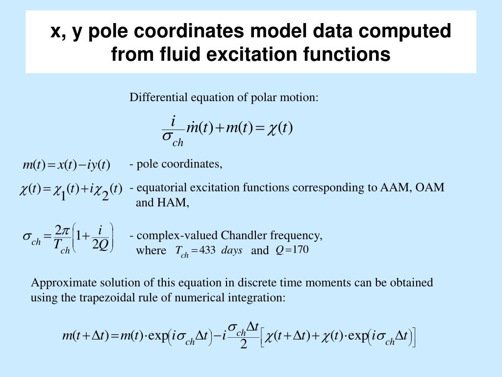 x, y pole coordinates model data computed from fluid excitation functions Differential equation of polar motion: - pole coordinates, • equatorial excitation functions corresponding to AAM, OAM • and HAM, • complex-valued Chandler frequency, • where and Approximate solution of this equation in discrete time moments can be obtained using the trapezoidal rule of numerical integration: