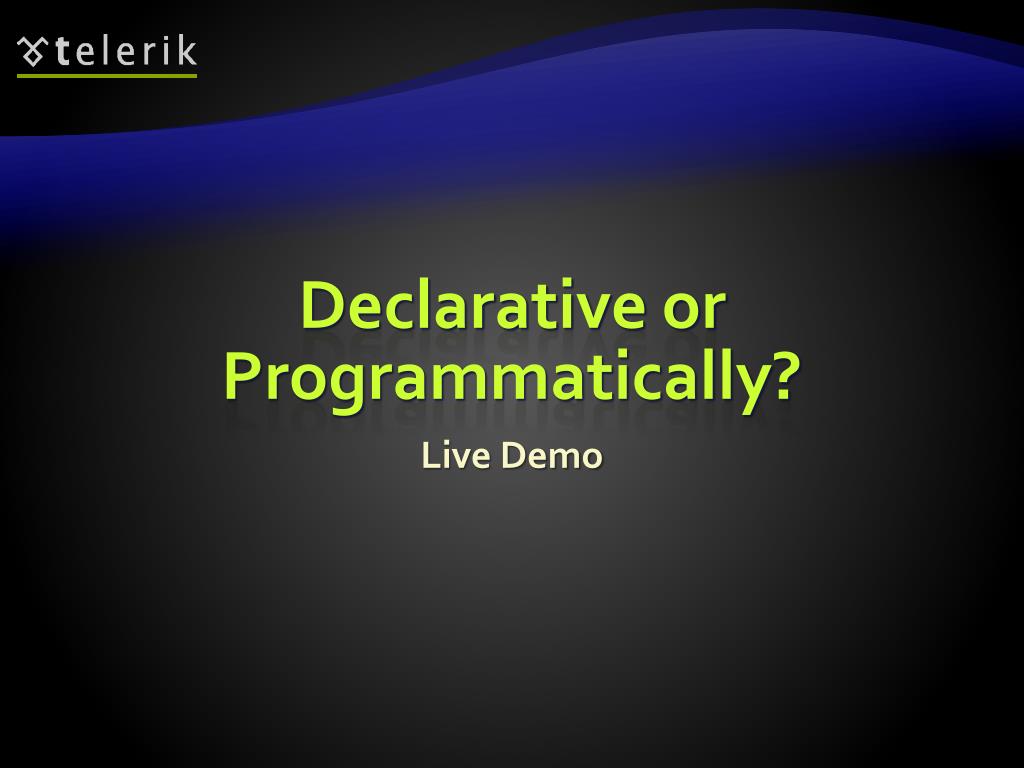 Declarative vs. Programmatically • In WPF/Silverlight each element can be done either declaratively or programmatically • No difference in the execution and speed • Instantiating element from the code behind ruins the idea of XAML • The same as Windows Forms • The following two examples are identical • From Code Behind • With XAML <Button Content="Click me!"/> Button button=new Button(); button.Content="Click me!";