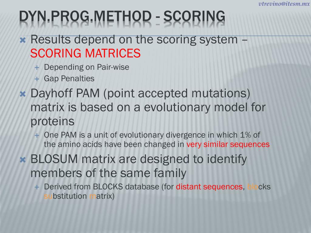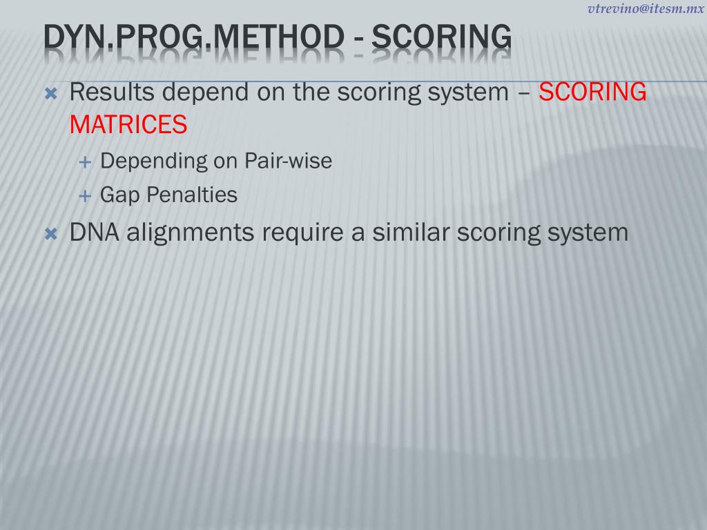 Results depend on the scoring system – SCORING MATRICES • Depending on Pair-wise • Gap Penalties • DNA alignments require a similar scoring system Dyn.Prog.Method - Scoring