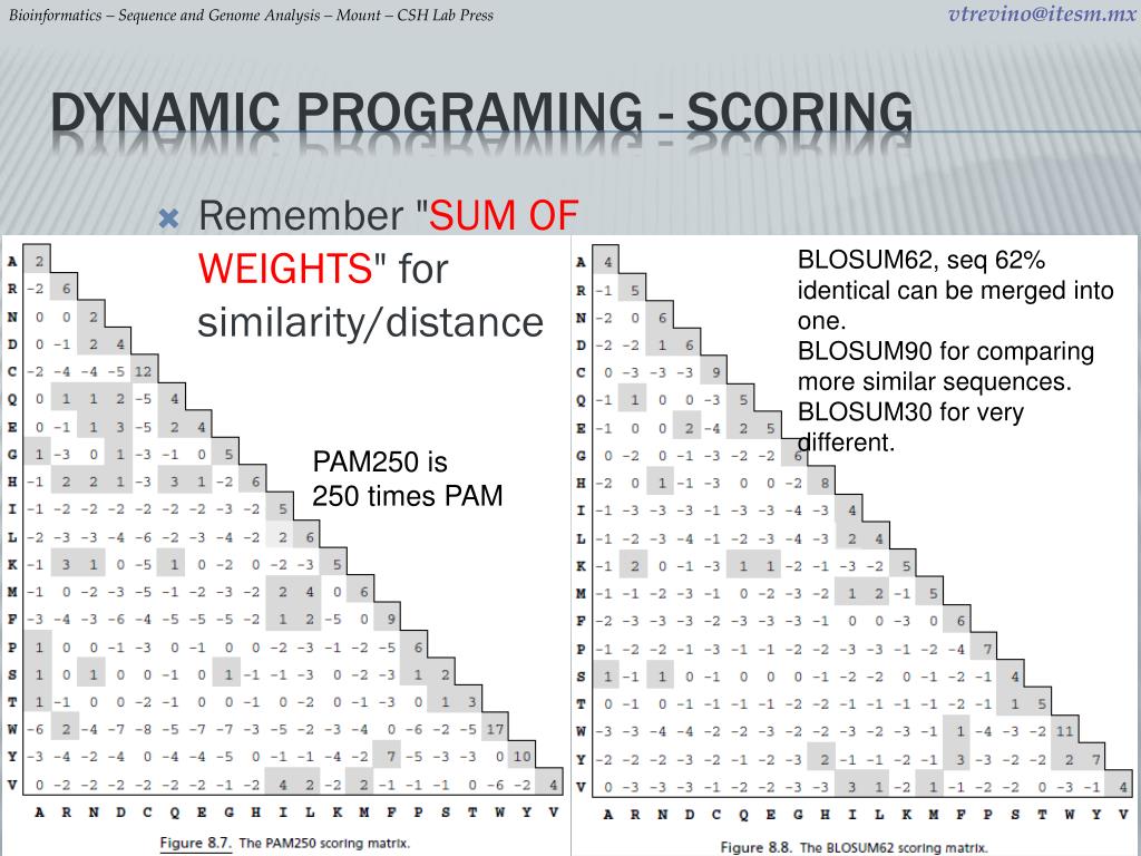 Bioinformatics – Sequence and Genome Analysis – Mount – CSH Lab Press Dynamic Programing - Scoring • Remember "SUM OF WEIGHTS" for similarity/distance BLOSUM62, seq 62% identical can be merged into one. BLOSUM90 for comparing more similar sequences. BLOSUM30 for very different. PAM250 is 250 times PAM