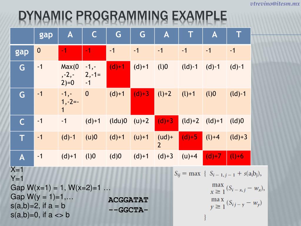 DYNAMIC PROGRAMMING EXAMPLE X=1 Y=1 GapW(x=1) = 1, W(x=2)=1 … Gap W(y = 1)=1,… s(a,b)=2, if a = b s(a,b)=0, if a <> b ACGGATAT --GGCTA-