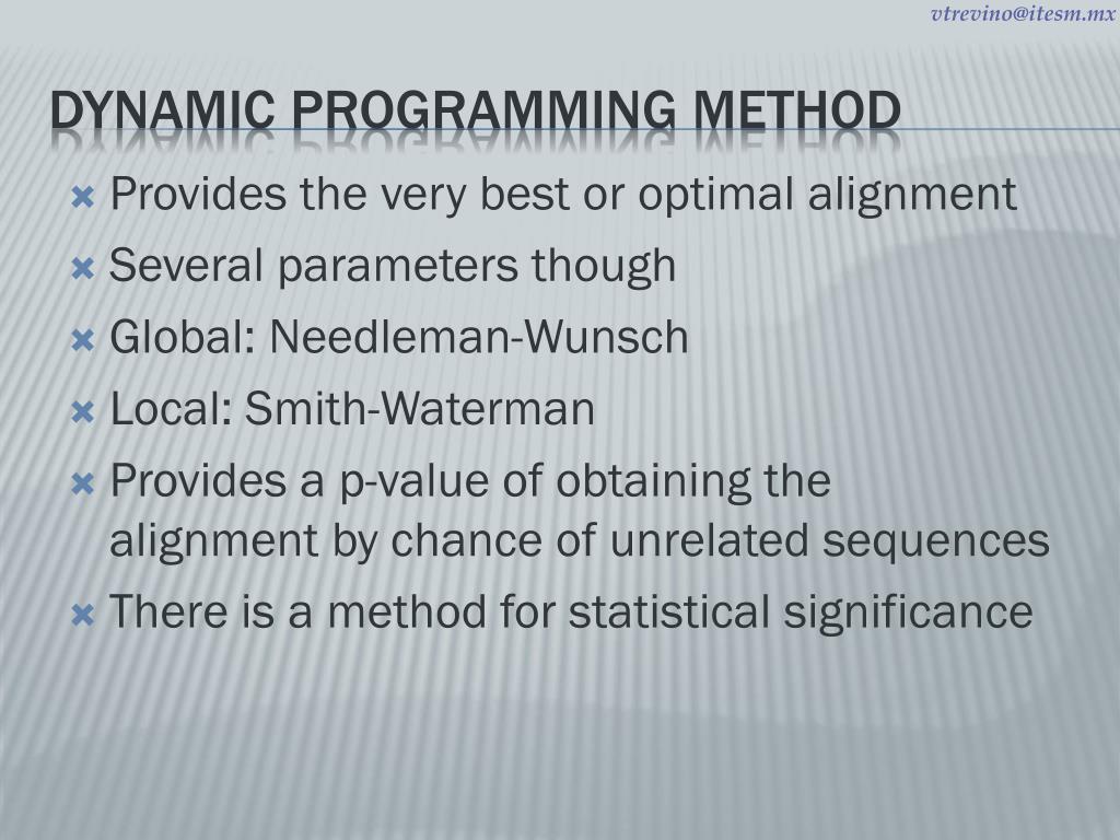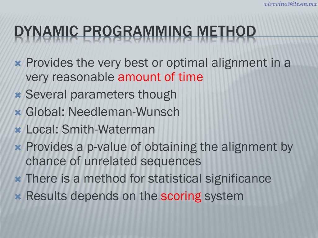 Provides the very best or optimal alignment in a very reasonable amount of time Several parameters though Global: Needleman-Wunsch Local: Smith-Waterman Provides a p-value of obtaining the alignment by chance of unrelated sequences There is a method for statistical significance Results depends on the scoring system Dynamic Programming Method