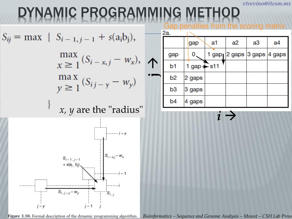 Dynamic Programming Method Gap penalties from the scoring matrix j x, y are the "radius" i Bioinformatics – Sequence and Genome Analysis – Mount – CSH Lab Press