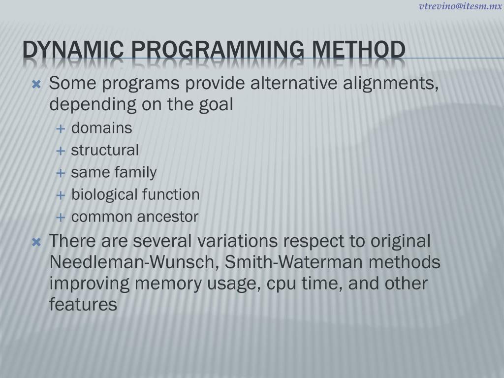 Some programs provide alternative alignments, depending on the goal • domains • structural • same family • biological function • common ancestor • There are several variations respect to original Needleman-Wunsch, Smith-Waterman methods improving memory usage, cpu time, and other features Dynamic Programming Method